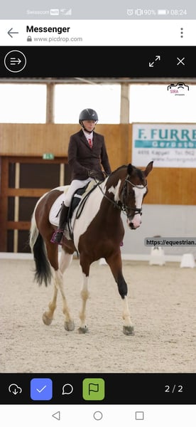Je cherche pour Duz (Insider's Special A) son foyer 5 étoiles. Il a été monté et éduqué par mes soins à l'âge de 4 ans. Avant cela, il a pu passer son temps au pré chez son éleveur. Il se montre toujours très intéressé par tout et aime apprendre de nouvelles choses. Il a trois excellents allures qui sont agréables à monter. Son potentiel se trouve dans le dressage. Il a réussi à obtenir la 2ème place lors de son premier concours de dressage (GA01), avec moi en tant que cavalière de dressage peu expérimentée. Il maîtrise également les changements de pied au galop, le galop extérieur et les mouvements latéraux. Il sort régulièrement en extérieur, seul et en groupe. Il est un peu sur l'œil, mais passe toujours partout. Le parcours de saut ne lui procure malheureusement pas de plaisir. C'est pourquoi je le vends, car je suis à l'aise en saut d'obstacles. À la maison, un cavaletti ou une croix ne posent pas de problème. Il aime beaucoup cela. Il est sage chez le maréchal-ferrant, pour le transport et le parage. Pas de cabrages ni de ruades. C'est un cheval pour un seul cavalier et ne sera pas vendu à une école d'équitation. Ce n'est pas un cheval pour débutants, car il a besoin d'un cavalier sûr avec du feeling. Pour des demandes sérieuses, veuillez me contacter par WhatsApp au 079/771 26 47.