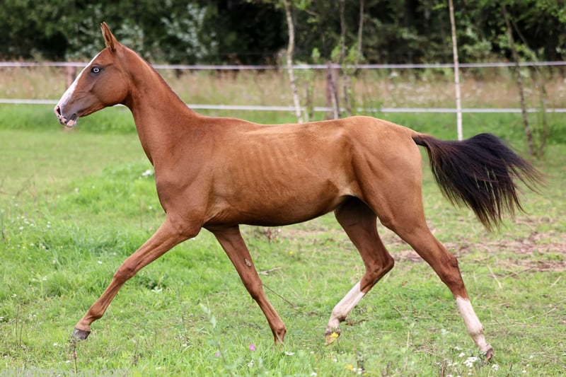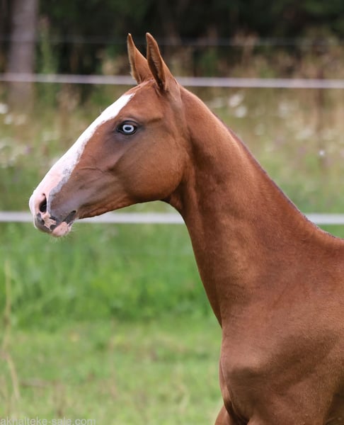 **For Sale: Akhal-Teke Mare** We are pleased to present a stunning Akhal-Teke mare, Sovhos-2 bloodline, born in 2024. This wonderful creature stands out for her captivating red coat and blue eyes. Her current height at the withers is 143 cm, but she has an excellent growth potential. Daykiri has a great pedigree, conformation, and temperament. Our mare is particularly suited for dressage, thanks to her intelligence and balanced temperament. She is an elegant and agile animal, perfect for riders of all levels looking for a trustworthy companion for their equestrian adventures. If you are interested in learning more about this extraordinary mare, please do not hesitate to contact us for further information and to arrange a visit. Don't miss the opportunity to add a gem like this to your stable!