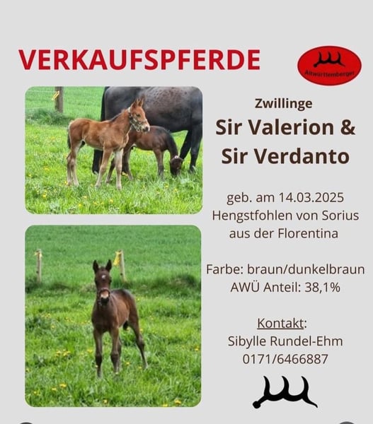 Zum Verkauf stehen zwei vielversprechende Alt-Württemberger Hengste, geboren im Jahr 2025. Mit ihrer eleganten braunen Fellfarbe und ihrem ansprechenden Erscheinungsbild sind sie ein wahrer Blickfang. Die ruhige und ausgeglichene Art machen sie zu einem idealen Partner die sowohl im Freizeitbereich als auch im Sport aktiv sein möchten. Sie sind gut sozialisiert, kennen den Umgang mit anderen Pferden und sind brav im Umgang. Mit der richtigen Förderung werden sie sich hervorragend entwickeln und viel Freude bereiten. Bei Interesse oder weiteren Fragen stehe ich Ihnen gerne zur Verfügung. Der Preis bezieht sich pro Fohlen. Besuchen Sie uns und lernen Sie diese tollen Hengste persönlich kennen!