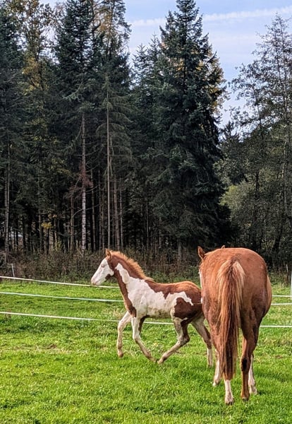 Verkaufe American Paint Horse Hengst – Splashed Overo, Geburtsjahr 2024 Zum Verkauf steht ein wunderschöner American Paint Horse Hengst, geboren im Jahr 2024. HI JACK TOP GUN besticht durch seine wunderschöne Scheckung und sein freundliches Wesen. Mit einem geschätzten Endstockmaß von 147 cm steht er im Standardpferdemaß der Reiner. Wer ein vielseitiges und charakterlich ausgeglichenes Pferd sucht, ist bei Hi Jack an der richtigen Adresse. Der junge Hengst ist gesund, gut sozialisiert und wurde liebevoll aufgezogen. Er eignet sich sowohl für den Freizeitbereich als auch für die Show / Zucht. Seine Eltern überzeugen mit bestem Charakter und Gesundheit. Sie können ebenfalls besichtigt werden, sowie 2 ältere Vollgeschwister von Hi Jack. Hi Jack Top Gun stammt mütterlicherseits aus einer Stocktype Ranch Horse Stute mit stabilem Fundament, umsichtigem Charakter und außerordentlich bequem zu reiten. Die Mutter JOKERS ENTERPRISE, eine Quarterhorse Stute, geht zurück auf sehr widerstandfähige und vielseitig einsetzbare kanadische Linien. Sein Vater vereint die erfolgreichsten Reining Linien, gepaart mit bestem Charakter und unglaublicher Lernbereitschaft. Vater WHIZ MY LITTLE GUN, ein Ausnahmehengst aus der Zucht von Steffen Breug, der so sanft und gutmütig ist, dass die Fohlen mit Mutter und Vater gemeinsam im Herdenverband aufwachsen dürfen. Hi Jack hat wie seine Eltern einen freundlichen, sehr angenehmen Charakter. Ihn bringt so schnell nichts aus der Ruhe. Seine Umgebung nimmt er gerne genau unter die Lupe. Seine schönen Bewegungen offenbaren, die väterliche Reiningabstammung. Er liebt es Aufmerksamkeit zu bekommen und neue Dinge zu lernen. Putzen, Hufe ausschneiden, Spaziergänge und Hängerfahren kann er routiniert. Als nächstes stehen Ausritte als Handpferd auf dem Programm. Paint Horse Papiere sind beantragt. Bei Interesse oder für weitere Informationen stehe ich gerne zur Verfügung. Besichtigung nach Vereinbarung möglich.