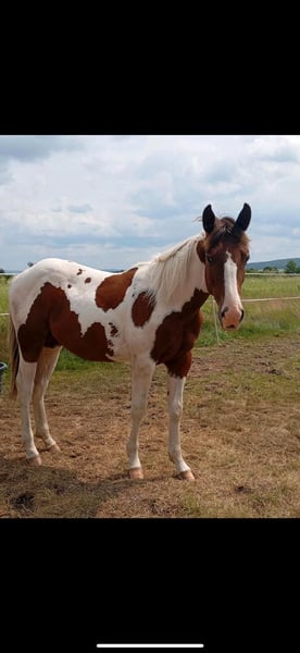 Sehr gelassener zutraulicher Jährlings -Hengst abzugeben. Er wurde am 13.6.24 geboren . Aus eigener Zucht . Farbe Bay . APHA Papier. Die letzten Fotos zeigen ihn als Fohlen . Über seinen Vater *DANCING BOYS OKIE* und Mutter *Kiwas little Cheyenne* ist er tobiano homozygot (vererbt immer seine Scheckung) und 7 - fach Panel negativ . Er hat also Reining - und Allround- sowie Cowhorse - Gene . Er wird sicher ein guter Partner im Freizeit Reiten werden . Er wäre aber auch für den Sport offen . Er kennt Hunde , Katzen und auch Lärm von Landmaschinen und zeigt dabei seinen ruhigen Charakter. Er wächst mit anderen Junghengsten auf und war vorher mit seiner Mutter in einer gemischten kleinen Herde auf großen Koppeln . Er gibt brav die Hufe , Hänger ist kein Problem , kennt bereits Fellsattel und leichte Gewichte , ist natürlich halfterführig, geimpft , entwurmt . Er ist neugierig und offen , bleibt stets gelassen . Er kann natürlich gern besichtigt werden bei ernsthaftem Interesse . Patz vor Preis .