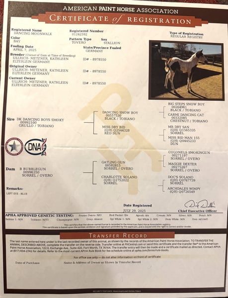 Exklusives Paint Horse Hengstfohlen – Farbe, Ausdruck und Perspektive vereint Ein Jährling, das Maßstäbe setzt: Dieser außergewöhnliche American Paint Horse Hengstjährling vereint eindrucksvolle Farbgebung mit herausragender Qualität und Präsenz. Geboren am 07.04.2025, fasziniert er bereits jetzt mit seinem typvollen Erscheinungsbild, einem korrekt aufgebauten Körper und dynamischen, ausdrucksstarken Bewegungen. Sein Charakter ist ebenso besonders wie seine Optik: aufmerksam, intelligent und dem Menschen zugewandt – ein junger Hengst, der gefallen will und mit Freude lernt. Er wächst unter optimalen Bedingungen im Herdenverband auf und wird behutsam an den täglichen Umgang herangeführt. Er beherrscht das altersentsprechende Fohlen- ABC. Seine erstklassige Abstammung prädestiniert ihn sowohl für den gehobenen Westernsport als auch für die Zucht. Ob Ranch Riding, Reining oder als zukünftiger Eyecatcher auf dem Turnier – dieser Jährling bringt das gewisse „Mehr“ mit. Rasse: American Paint Horse Geschlecht: Hengst Farbe: Bay Tovero Wir suchen für diesen besonderen Nachwuchshengst ein Zuhause, das seine Qualität erkennt und ihn entsprechend fördert. Preis: VB 10.000E Standort: 07980 Berga- Wünschendorf Nur in ausgewählte, fördernde Hände abzugeben.