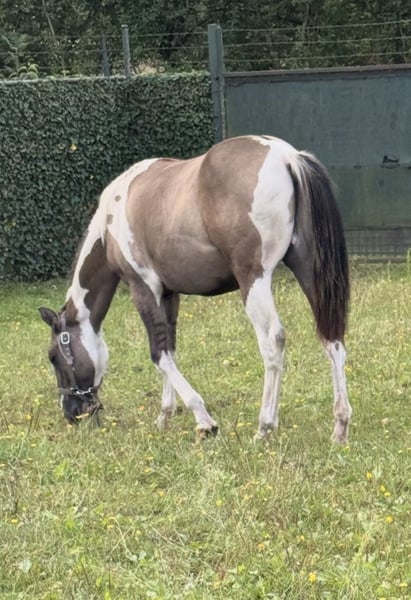 Ogier APHA, grullo Tobiano, homozygot czarny/tobiano (50% szans na dun-stripe) EE aa Dd TT. Panel 7 NN. Bardzo łagodny i przywiązany ogier, łatwy w obsłudze. Rodowód/paszport/zaszczepiony i odrobaczony itp. Cena 8500 €. W celu uzyskania dalszych informacji prosimy o kontakt telefoniczny pod numer +32/0483 39 02 03.