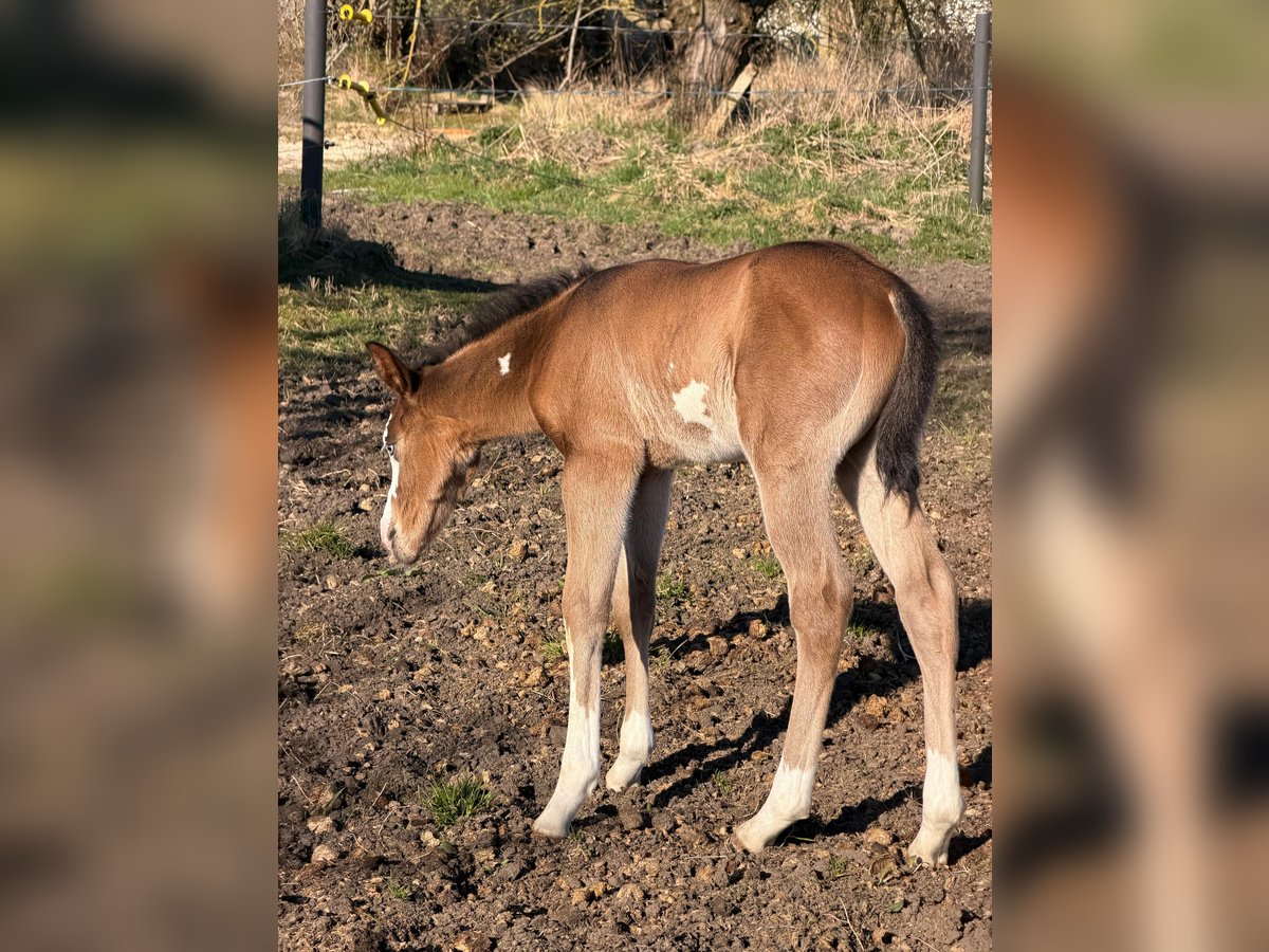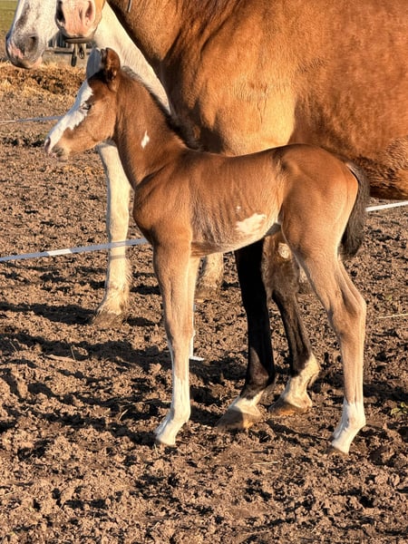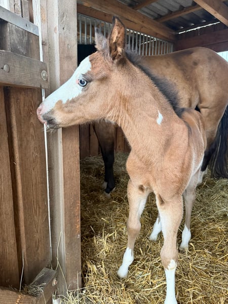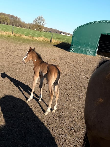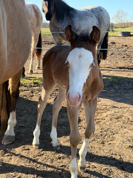 Hes A Diamond Chex ist ein hochwertiges Paint Horse Hengstfohlen, geboren am 29.03.2026, in der außergewöhnlichen Farbgebung bay dun overo splash (Farbtest läuft). Mit einem zu erwartenden Endmaß von ca. 153 cm präsentiert er sich als kompakter, korrekt gebauter und vielversprechender Nachwuchshengst mit guten Proportionen und viel Ausdruck. Dieses Hengstfohlen überzeugt nicht nur optisch als absoluter Eyecatcher, sondern auch durch seine natürliche Präsenz und seine lockere, elastische Bewegungsqualität. Durch seine interessante Abstammung eignet er sich besonders für den Reining- und Allroundbereich, ist ebenso für den ambitionierten Freizeit- oder Turnierreiter eine spannende Perspektive. Charakterlich zeigt er sich außergewöhnlich menschenbezogen, freundlich und unkompliziert. Er ist neugierig, clever und gleichzeitig gelassen in neuen Situationen. Typisch Fohlen bringt er eine fröhliche, leicht freche Art mit, bleibt dabei aber stets cool und nervenstark. Umweltreize wie Landmaschinen, Autos und alltägliche Geräusche kennt er bereits und nimmt diese völlig entspannt an. Hes A Diamond Chex wächst artgerecht im Herdenverband mit anderen Fohlen auf und wird hochwertig aufgezogen. Er erhält altersgerechtes Aufzuchtsfutter, ist regelmäßig entwurmt und gesundheitlich unauffällig. Der aktuelle 5-Panel-Test ist n/n. Im täglichen Umgang wird er konsequent, aber liebevoll gehändelt. Er kennt bereits den Tierarzt sowie den Hufschmied und wird ans Halfter gewöhnt. Das Fohlen-ABC wird kontinuierlich gefestigt. Zusätzlich kennt er das Verladen und fährt problemlos im Anhänger. Auch erste Ausflüge ins Gelände gehören bereits zu seiner Entwicklung. Dieses Paint Horse Hengstfohlen bringt beste Voraussetzungen für eine Zukunft im Sport sowie im gehobenen Freizeitbereich mit. Durch seinen Charakter, seine Nervenstärke und seine natürliche Coolness ist er sowohl für ambitionierte Turnierreiter als auch für Freizeit- und Familienpferdehalter interessant.