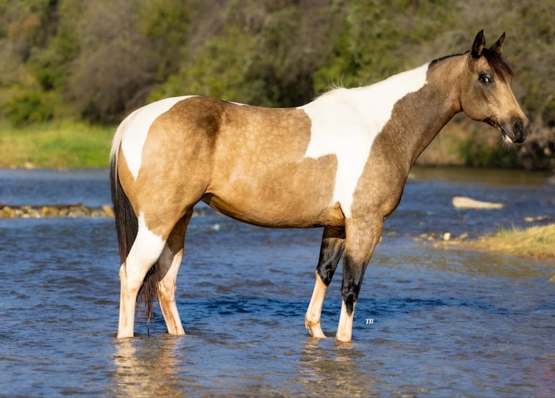 ONLINE AUCTION Place your bids at www.PlatinumEquineAuction.com Starting Bid $3500 Auction ends November 17th, 2024 Need a new saddle? Check out White Rock Saddles on our website or Facebook! Jenna is the most stunning 9 year old buckskin and white paint mare standing at 15.2 hands tall. Not only is she the sweetest horse in the barn, she is stunning to look at and is sure to get you noticed anywhere you go. Jenna has been used in a lesson program, been rode on the ranch doing day work, trail rode and rides English with a beautiful style. She is gentle and great for any member of the family. Most of all she is safe to be around as well as ride. She stands in cross ties for grooming , loads and unloads in the trailer easy, stands for baths, rides bareback, traffic safe and just a great all around horse. Jenna would excel in all the events from showing in Halter to English or Western events. Her personality is definitely sweet and willing to do any job ask of her without any hesitation. She has truly been a pleasure to have in our barn and we look forward to finding her the perfect home where she will be loved! Please call or text Megan at 572-205-5282 with Florinia Equine to arrange a time to come see her in person or have a FaceTime viewing if you live far away. This mare is definitely one you don’t want to miss the opportunity of owning. She is the kind you search long and hard to find that’s perfect for the whole family! She is up to date on coggins and fresh feet trimming. She is currently shod on the front feet, barefoot on the back and is great for the farrier. Shipping can be arranged anywhere. Located in Guthrie, OK. ONLINE AUCTION Place your bids at www.PlatinumEquineAuction.com Starting Bid $3500 Auction ends November 17th, 2024 Need a new saddle? Check out White Rock Saddles on our website or Facebook!
