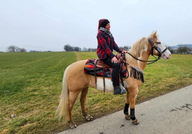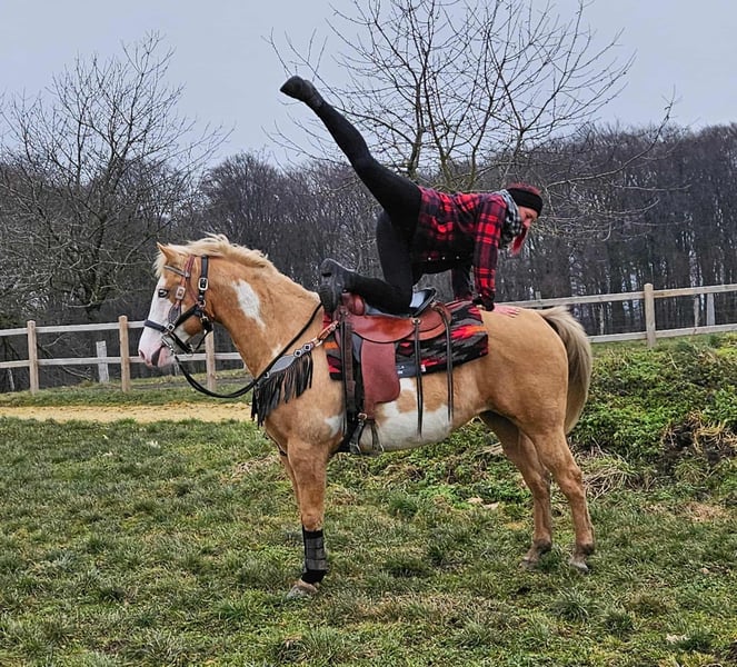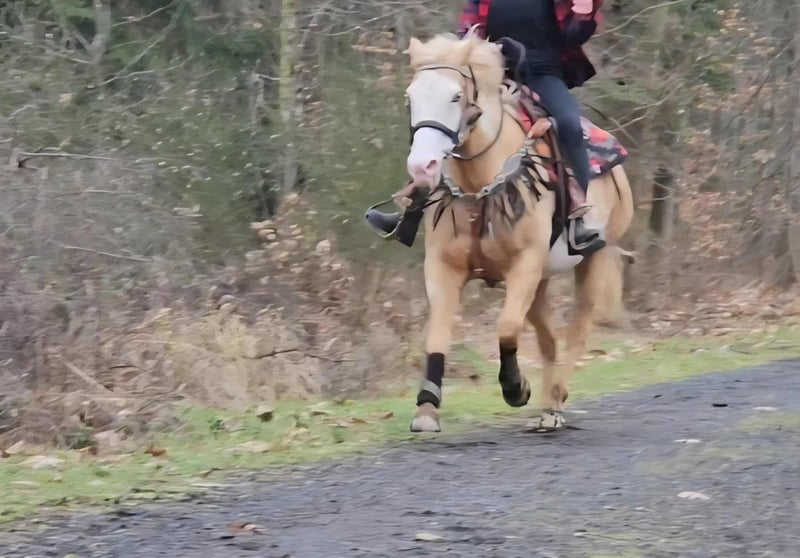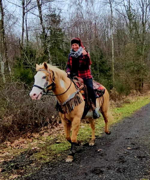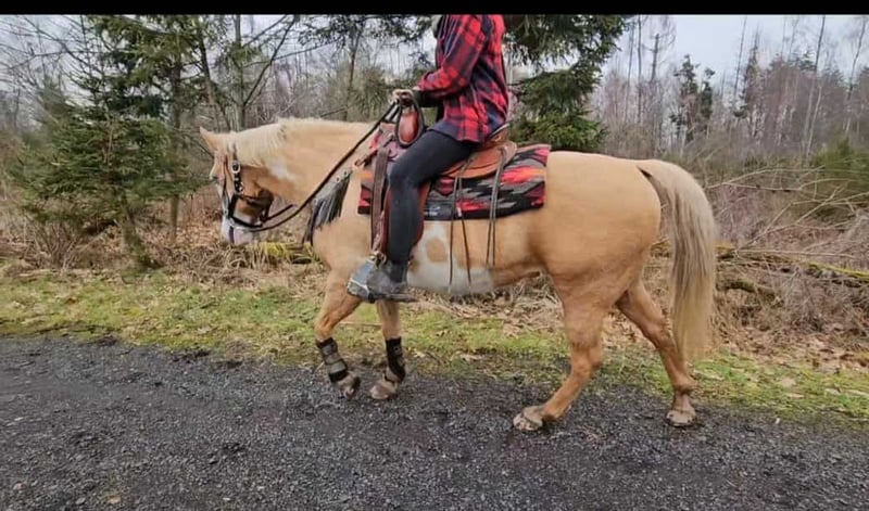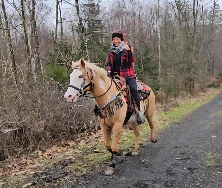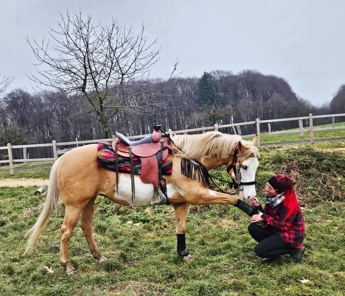 Beautifully marked Palomino Overo mare – well-behaved, rideable, and reliable Age: turning 11 in June Height: approximately 1.57 m (16.1 hh) Price: €7,800 AKU: available ✨ Description: This stunning Palomino Overo mare captivates not only with her distinctive markings but also with her balanced and friendly nature. In daily handling, she proves to be exceptionally well-behaved, calm, and uncomplicated. Grooming, leading, and general stable routines are completely trouble-free for her. Under saddle, she is very rideable and pleasant to ride – both in the arena and in the terrain. She works reliably, is sensitive to aids, and provides her rider with a secure, relaxed feeling. Thanks to her gentle nature, she is an excellent, dependable partner for leisure riding. Ideal for: Riders seeking a well-behaved, honest, and rideable mare for recreational riding, trail riding, and arena work. Also suitable for relaxed leisure riders who value a reliable horse. Our horses are regularly: – dewormed – attended to by the blacksmith – osteopathically checked Farm shop: Western saddles, bridles & accessories Transport and equipment can be organized affordably upon request Our services: ✅ 3-month exchange guarantee ✅ Test ride: €35, each additional horse €25 (credited on the day of purchase) ✅ €100 immediate discount for pickup or transport on the same day ✅ Personal & honest advice Please inquire exclusively by phone: 0171 – 4001968 Available daily from 8 a.m. to 8 p.m. ⚠️ No emails or WhatsApp messages ⚠️ All information without guarantee