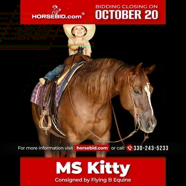 ♦️ 𝐭𝐡𝐞 𝐀𝐌𝐄𝐑𝐈𝐂𝐀𝐍 𝓕𝓪𝓵𝓵 𝓒𝓵𝓪𝓼𝓼𝓲𝓬 ♦️ Happening now thru MONDAY | OCTOBER 20th - Available EXCLUSIVELY on HorseBid's website! For more details and to register visit: www.Horsebid.com CONSIGNOR CONTACT: Flying B Equine 330-243-5233 LOCATION: Lufkin, TX BREED: APHA REGISTERED: Yes REGISTERED NAME: GUNNA BE A STAR COLOR: Sorrel HEIGHT: 15 AGE: 11 GENDER: Mare *GUNNA BE A STAR* And to us, that is exactly what Ms Kitty is! A 2014 APHA mare by the great $16M producing stallion “GUNNATRASHYA” out of a daughter of “GRAYS STARLIGHT”. Ms Kitty stands 15.0HH, stands stout, and has also produced two foals on record as well as won over $1,000 in the NRHA. She is a proven producer with her foals already winning over $7000 in the reining. Ms Kitty is a great first performance horse for a youth or beginner wanting to enjoy the amateur reining or transition into the ranch riding. Ms Kitty is easily maintained at home, does not require a program. Ms Kitty is currently being used in our lesson program as well to teach beginner children how to lope as she is easy to maneuver, and transition into her slow, smooth and easy lope! She is beyond forgiving and easy to get along with! She will also leave the arena and go trail ride, cross water, bridges and more! We even rode her through traffic and in town! Ms Kitty has also been exposed to cattle, so helping gather on the ranch is just another thing you can enjoy doing with her! In the arena, Ms Kitty has all the buttons, preforms them effortlessly and is beyond forgiving! She has beautiful transitions, effortless lead changes, controllable spins, and so much more! She side pass to work a gate, goes over tarps, obstacles and more. She will easily transition into the ranch riding, and ranch trail! She would be great for a kid looking for a new best friend to join 4H with, or a beginner to start their show career. At the barn, Ms Kitty is easy and simple! She has absolutely no weave, crib, bite, bolt, kick or rear. She is easy to shoe, bathe, tack and groom. She jumped right onto the trailer and backs off! She is great being stalled but really does enjoy her turn out and will be the first to greet you at the gate! She does not care about other horses and will go out by herself, in a group of geldings or mares with no problems. Ms Kitty is fully UTD on everything, including her maintenance. We have x-rays on file from when we purchased her, that you're more than welcome to review. Ms Kitty is with us in Lufkin, Texas and we can help arrange shipping absolutely anywhere! You’re welcome to do your own PPE, come meet her or ask any questions! Please reach out to me at (330) 243-5233.