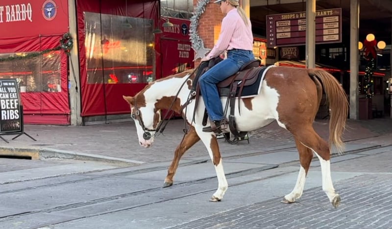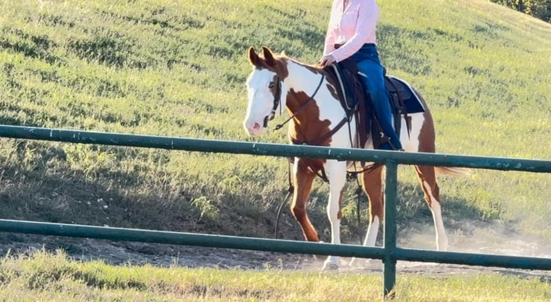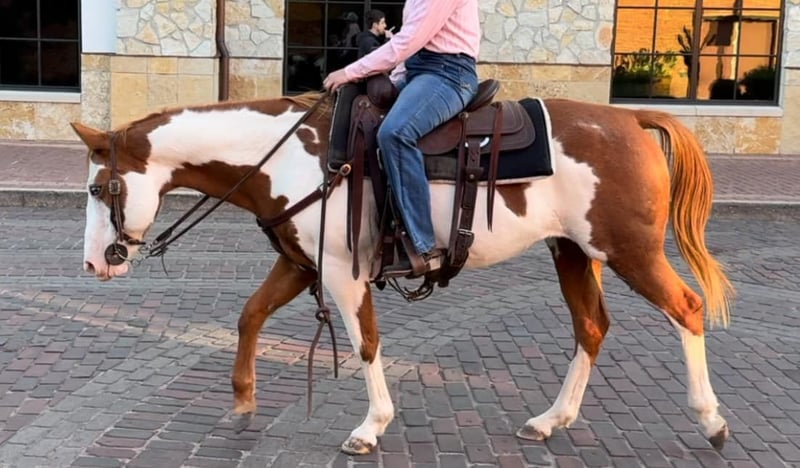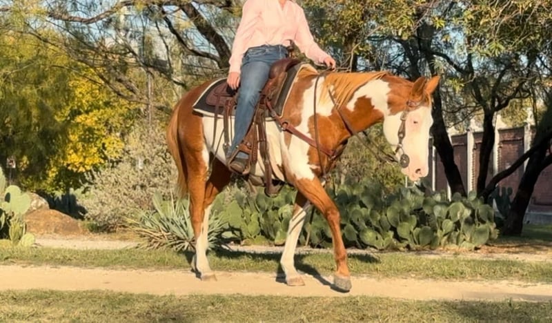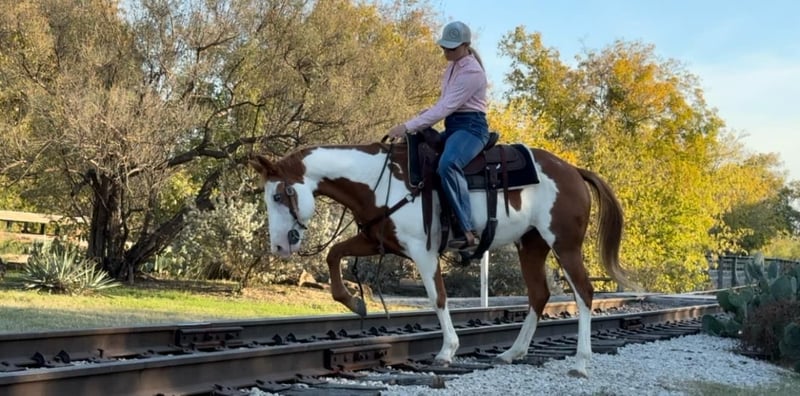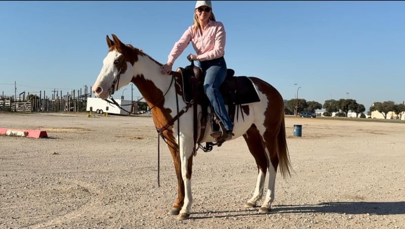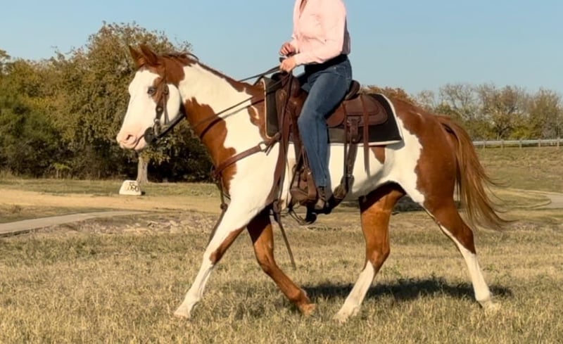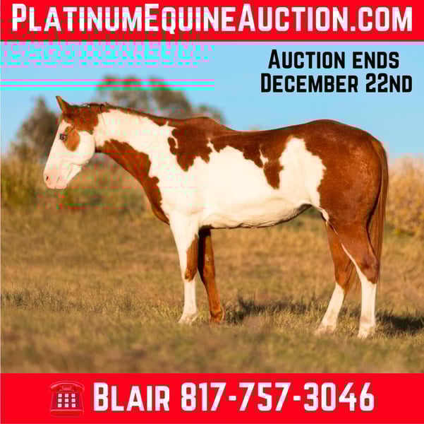 ONLINE AUCTION Place your bids at www.PlatinumEquineAuction.com Starting Bid $3500 Auction ends December 22nd, 2024 Need a new saddle? Check out White Rock Saddles on our website or Facebook! Cindy is a 14.2H, 12 yr old sorrel and white paint mare that would be perfect for the laid back, more whoa than go type rider! Her favorite speed is slow and she would excel with someone who just wanted to blaze the trails or have a backyard mount to pleasure ride. She’s been with a family whose kids rode her all over their little farm. Cindy is an in your pocket mare and super sweet! She just wants to be loved on and wants the easy laid back life! She will neck rein or direct rein, goes the speed you ask, and stops when you ask her to. She gets along with everyone and everything and is a very laid back mare! She has zero buck, bolt or rear and isn’t not a spooky! Cindy is UTD on teeth, feet and coggins and ready to go! She loads, leads and ties great and is ready to be someone’s laid back trail blazer!! More pics and videos on her website page at northtexashorsecompany.com/cindy. Please call Blair with North Texas Horse Company for more info at 817-757-3046. We are located in Weatherford, TX and can help arrange affordable shipping to anyone!! ONLINE AUCTION Place your bids at www.PlatinumEquineAuction.com Starting Bid $3500 Auction ends December 22nd, 2024 Need a new saddle? Check out White Rock Saddles on our website or Facebook!