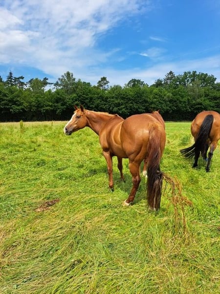 Weil meine Gesundheit leider nicht mehr mitmacht, muss ich schweren Herzens meine geliebte Paint Horse Stute "Red Steppin Dona", genannt Donna verkaufen. Donna ist am 03.04.2010 geboren, 154 cm ,kerngesund, im Leistungstyp Reining gezogen. Sie hat eine erstklassige Abstammung ( Vater Red Pebbles) und ist daher sicher auch für Züchter interessant. Ich reite sie freizeitmäßig Western und mache Bodenarbeit und Freispringen. Donna reagiert sehr fein auf die Hilfen, ist butterweich zu sitzen, geländesicher, geht ins Wasser und liebt den Kontakt zu Menschen. Da sie viel Power und Vorwärtsdrang hat, ist sie für Anfänger nicht geeignet. Sie braucht eine erfahrene Reiter/in, die sich durchsetzen kann. Donna kommt gut in Stutenherden in Offenstallhaltung zurecht, kennt aber auch Boxenhaltung mit Weidegang. Sie ist schmiedefromm, lässt sich problemlos verladen und ist frei von Gendefekten (5 Panel Test vorhanden). Nur in liebevolle Hände, VB 6500 Euro inklusiv Sattel und Equipment, Haltung vor Preis.
