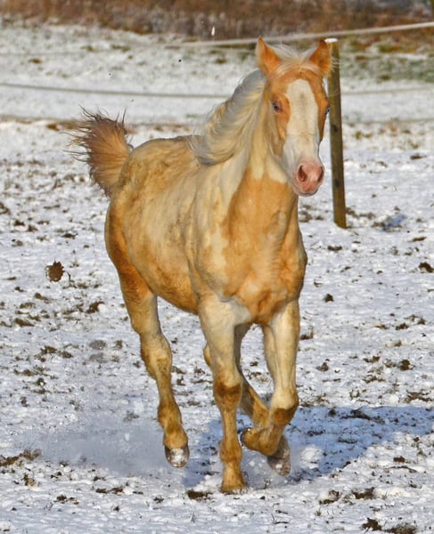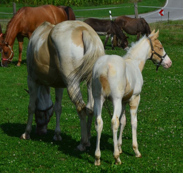 Brezel is homozygous for Tobiano and Champagne! Her foals will always be colorful and Champagne colors. She herself is a Gold Champagne pinto. Of course also 7 panel N/N. She gets passport and papers from the APHA and PHCG. Brezel has a blue eye. She is a little heartbreaker who really demands to be scratched.