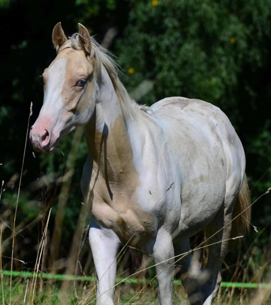 OBNIŻONA DO 01.04. Brezel jest homozygotyczna dla Tobiano i Champagne! Jej źrebięta zawsze będą kolorowe i w kolorze Champagne. Sama jest złotą Champagne Dun sroką. Oczywiście również 7 Panel N/N. Otrzyma paszport i dokumenty od APHA i PHCG. Brezel ma niebieskie oko. Jest małą łamaczką serc, która naprawdę domaga się głaskania.