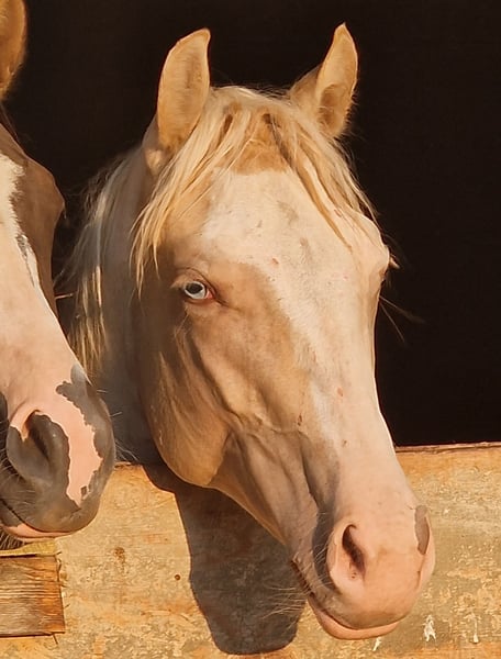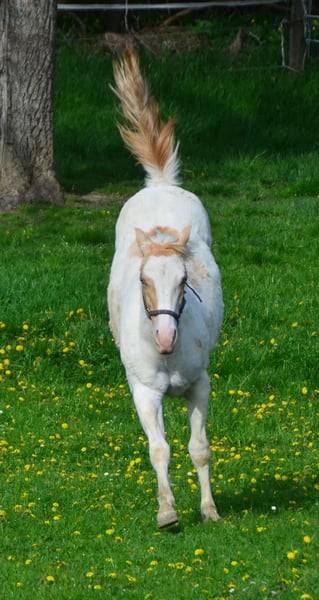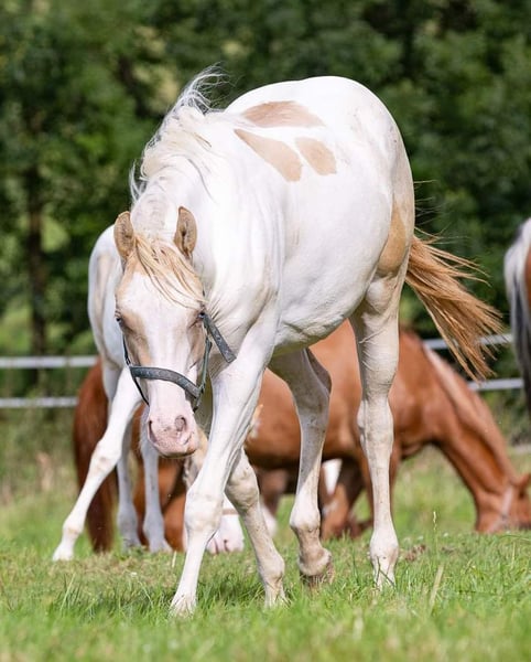 Lyria è una bellissima puledra Paint Horse in Gold Dun Champagne Tovero, con due occhi blu acciaio. Nata il 03.06.2023 È coccolona, dolce e ben educata. Le piace mettere lo zoccolo sull'acceleratore e sfrecciare nel paddock. Mostra il suo incredibile talento nel controllo della velocità, nei cambi di canter e nelle fermate! Ha 7 pannelli N/N grazie ai suoi genitori. Lyria ha vinto la mostra di allevamento PHCG con un punteggio complessivo di 8,0.