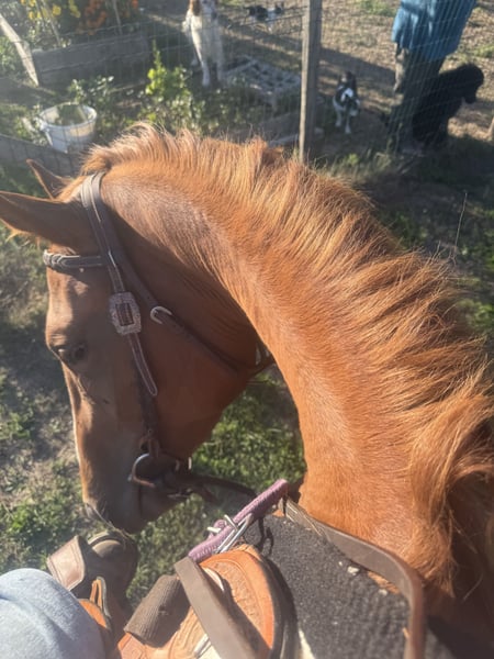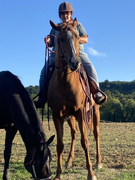 Stute Paint Horse von 2022, einfarbig rotbraun. Tochter von Amazing Hot N Rich und Sensational Pinkasset. Im Anfang des Jahres angeritten, ist sie sorgfältig, harmonisch und hat hervorragende Gänge, sehr bequem. Sie ist sehr umgänglich und menschenbezogen. Ein außergewöhnlicher Charakter! Trächtig von meinem Hengst Classic Cowboy Spirite, Apha/Aqha, braun sabino overo.