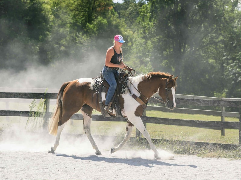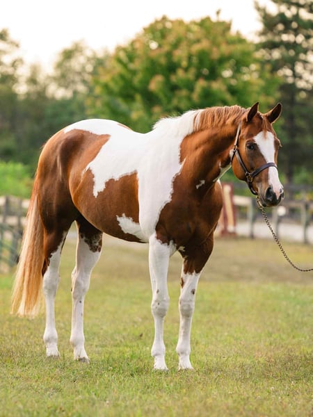 ♦️ 𝐭𝐡𝐞 𝐀𝐌𝐄𝐑𝐈𝐂𝐀𝐍 𝓕𝓪𝓵𝓵 𝓒𝓵𝓪𝓼𝓼𝓲𝓬 ♦️ Happening now thru MONDAY | OCTOBER 20th - Available EXCLUSIVELY on HorseBid's website! For more details and to register visit: www.Horsebid.com CONSIGNOR CONTACT: Triple R Horses 610-806-2613 LOCATION: New Holland, PA BREED: APHA REGISTERED: Yes REGISTERED NAME: Change The Code COLOR: Chestnut Tobiano HEIGHT: 16.1 AGE: 5 GENDER: Mare “Change The Code” lovingly known as “Stella” is a 16.1hh, chestnut tobiano mare. Stella is classy, safe, kind, honest, and a total do-it-all horse, with limitless opportunities!!! If you are looking to turn heads, and feel safe on your equine partner, this is the girl for you. Not only is Stella as stunning as they come, she has a fabulous pedigree, and she is grandsired by the famous “VS Code Red”. Whether you are looking for a show horse, a trusty trail partner, a husband horse, family horse, or an all around versatile pal, Stella is ready to step up and take any role that your heart desires. Stella can live in or out, with a mixed group, or by herself. She is not marish in a herd, and she will make it a point to be the first one to greet you in the pasture. She will follow you around in the pasture and is extremely nosey. She is in your pocket and in my opinion prefers the company of humans sometimes, rather than horses. I can really appreciate her attitude towards others, the boys can be up her butt in the pasture and I have never seen her be mean towards them, she is one of the bros. Even when she is in heat, you can’t tell, she doesn’t holler for the geldings etc. In the barn she has zero bad habits. No cribbing, chewing, weaving. When she is in heat, and you enter her stall while she is eating, she will make a mare face, but does absolutely nothing mean or rude. She will hang her head out of her stall and ask for love and proceed to fall asleep in your arms. Stella stands on the cross ties to be groomed, tacked, bathed, etc. She doesn’t care about dogs or kids running around and is very appreciative of attention. She is safe for beginners to work with and around, as well as kids and small children. Stella has good ground manners, and can be trusted with novice horse people. Stella is great for the vet and farrier. She is an easy keeper with a simple diet, no maintenance, and never asks for anything. Stella absolutely loves trail riding. She is always up for a good adventure, and takes care of her rider. Stella will lead, follow, go alone and in groups. She crosses water, bridges, logs, rocks, safe with traffic, bikes, wildlife, dogs trailing her heels, you name it!!! She has packed around my guests and friends and would make an awesome husband horse. She loves to explore and is sure footed. Through thick brush, along side of a lake, to a trail as skinny as her hooves with a cliff on both side, Stella has proved to be a very trusted, safe, trail partner. I could see her enjoying camping, fox hunting, paper chases and more. I even pulled her bridle off and rode her for about an hour with just a neck rope. I added lots of trail videos to show her good mind, and love for trails. She is safe around cows and is good friends with my mini cow. Stella is brave on the trails and not spooky. Stella rides western, english, and bareback. She will ride in anything from a halter and lead rope, to a shank bit. She is soft in your hands and listens well to your cues. Stella will ride off of your seat, or hands. While her gaits are big and floaty, she is comfortable and has great rhythm. She has soft buttons, meaning she can have fun with an advanced rider, yet is subtle and gentle enough for kids and beginners. I haven’t met a horse as versatile as miss Stella in a long time. She is such a joy to ride and play with different disciplines. Stella throws potential in every single direction. Not only would she be a super star with western dressage, but classical dressage too. I can see her doing ranch trail classes, trail obstacle courses, and more. Stella is already a proven show horse, she knows the ropes and has the grit. In the ring, Stella will walk, trot, canter, and knows her leads. She will ride collected or on the buckle, and I have also ridden her without a bridle. Stella will move laterally off of leg, pivot, side pass, back up, whoa, and neck reins. She has been started on a lead change as well. You can adjust her head set for the different disciplines. She is the same horse every time, whether she sits for weeks or is ridden all week. I would consider her the perfect combo of whoa and go. She will happily go around slow and easy yet you don’t need a crop and spurs to ask her to go to work. She can do a job for you then come right back down for a kid to hop on. She is very mature especially for her age, and if her brain is this good now, it will only get better. Her previous connections did a splendid job with her, and everyone that meets her, loves her. Stella was very lightly introduced to fences when I purchased her. I have also lightly furthered along in that department. Since she is young, she has not been pushed. And all of the jumping she has done so far in life has been for fun. She shows an interest in jumping, and I did recently raise the pole a little and she had plenty of scope. Since she is five, cross rails and small stuff is plenty for her right now. But she showed me that she has the ability to go higher. I also introduced her to cross county fences, first lunging her over them, then popping over one time under saddle. She did great so I left it at that. As she matures and gets older, her future owner could have a lot of fun with jumping. She could easily be a fox hunter, or a hunter jumper. Her experience with jumping so far has been slow and steady. Setting her up for success in the future! With Stella’s beautiful movement, and scope over fences, I could totally see her rocking it in the eventing world. Stella has