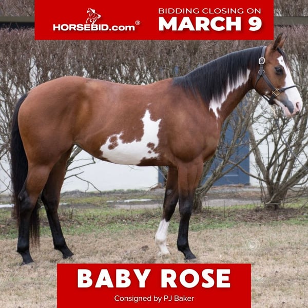 ℳ𝒶𝓇𝒸𝒽 ♦️𝐑𝐈𝐃𝐄𝐑'𝐒 𝐂𝐇𝐎𝐈𝐂𝐄♦️ Happening now thru MONDAY | MARCH 9th - Available EXCLUSIVELY on HorseBid's website! For more details and to register visit: www.Horsebid.com CONSIGNOR CONTACT: PJ Baker 530-366-7445 LOCATION: La Grange, KY BREED: Paint REGISTERED: Yes REGISTERED NAME: BABY ROSALITA COLOR: Bay Overo HEIGHT: 14.1 AGE: 7 GENDER: Mare "BABY ROSALITA More affectionately known around the barn as Baby Rose. This, 2018 APHA Bay Overo Mare, has never met a stranger. Home raised. Track tested. Country proven. Rosalita is a 7-year-old mare backed by bloodlines known for cow sense, athleticism, and longevity. A perfect investment as a broodmare later on down the road. This is a family that consistently produces sound, trainable, versatile horses that go on to work, and compete. She has been ponying racehorses at the track for the past several months and has been exceptional. She handles pressure, speed, and high-energy situations with maturity and confidence. She is fit, conditioned, and ready to step into her next job, whatever that may be. Out on the trail she is incredibly sure-footed and attentive. She naturally travels with her nose down and takes care of her rider. She’s the one you depend on in rough terrain. While she can move out when asked, she is just as happy on a relaxed, more woah than go, trail ride. • First to the gate to be caught • Greets you with a nicker every time • Happily stalled or turnout • Stands for grooming, saddling, and the farrier • Very happily barefoot • No maintenance • Easy keeper • Consistent after time off — jump on bareback or saddle up and go Standing at 14.1 she offers versatility for ranch work, rodeo performance, or as a dependable, all-around family partner out on the trail, plus so much more. Granddaughter of Freckle Face Smoke — the 2010 APHA #1 Leading Barrel Sire by Points Earned and one of the most decorated paint stallions in NRCHA history. He remains the only horse to win the NRCHA Hackamore Classic two consecutive years. Her grandmother, Rosa McCue, was a serious high-earning performance mare with recorded lifetime earnings of $187,235. Just to name a few.. Fit. Sound. Honest. Ready for her next chapter. Come check her out! Located in La Grange, KY. For more info contact Page anytime! @ 530-366-7445. "