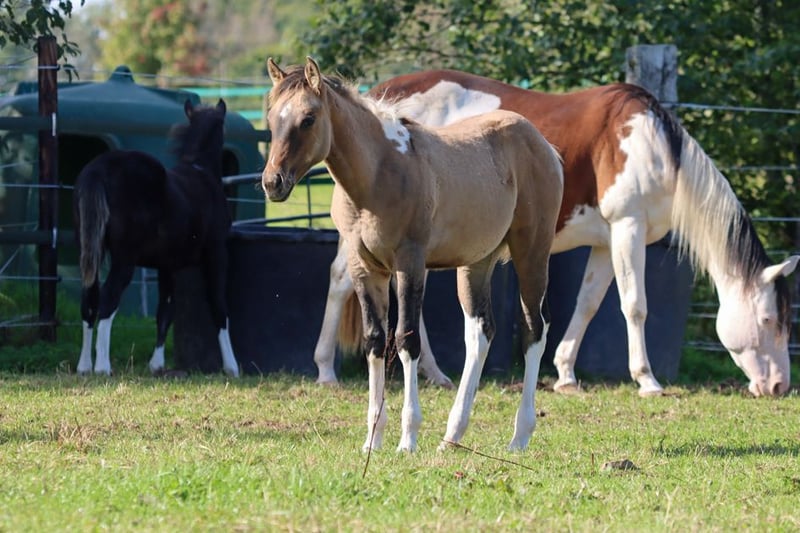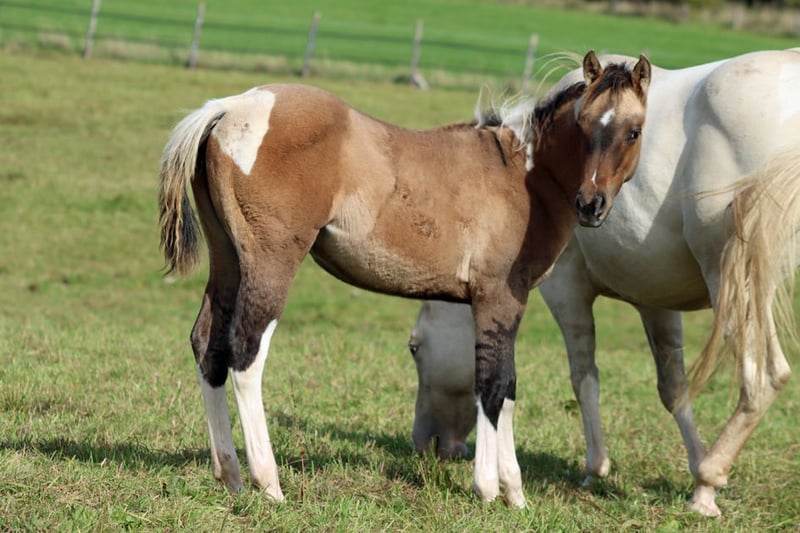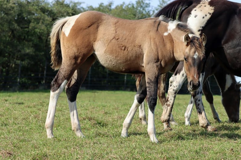 CHEYENNES VQ KAHLUA Gniada kasztanowata tobiano APHA. (Homozygot tobiano i czarny) Urodzona: 25.05.2025 Wzrost około 153 cm 7 panel N/N EE Aa Dd TT