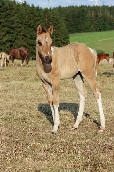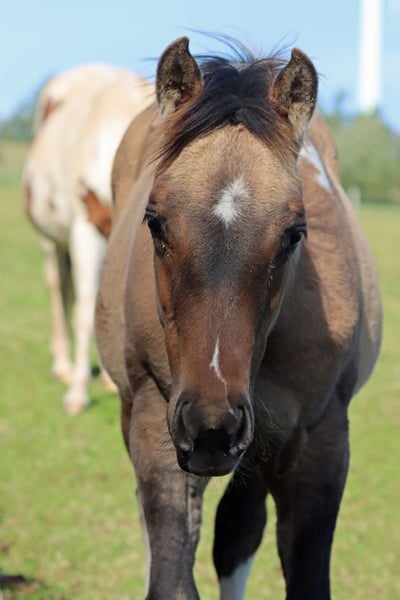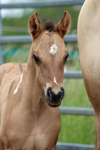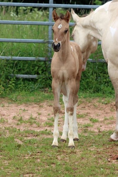 CHEYENNES VQ KAHLUA Bay Dun Tobiano APHA Stute. (Homozygot Tobiano und Black) Geboren: 25.05.2025 Engrösse ca 153 cm 7 Panel N/N EE Aa Dd TT