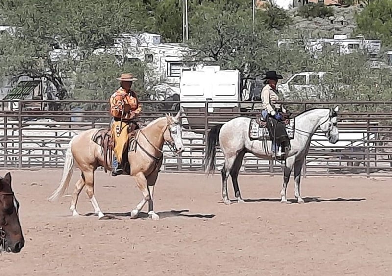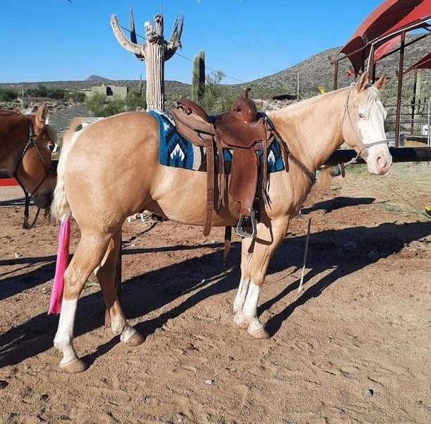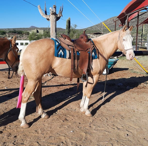 ⚜ The HERITAGE Classic ⚜ Happening now thru MONDAY | AUGUST 11th - Available EXCLUSIVELY on HorseBid's website! For more details and to register visit: www.Horsebid.com CONSIGNOR CONTACT: MTM Ranch 480 488 4538 LOCATION: Cave Creek, AZ BREED: APHA. REGISTERED: Yes REGISTERED NAME: Pistol Packing Dude COLOR: Palomino HEIGHT: 15.1 AGE: 11 GENDER: Gelding “Pistol Packing Dude” is a perfect prime age gelding with that stunning “iridescent” chrome gene Palomino color. His rare color is all set off with a thick beautiful creamy mane and tail that we have to trim 2 inches a month to keep off the ground. Pistol is flawless without a splint, bump or lump. He has Career earnings of over $30,000, gladly carrying dudes in his four, five and six year old year for us. The last four years he as only been Guided on. Extensive training in the arena started in his 6 year old year. He had never really even loped or stopped hard before that so chances of bad hocks and all those early hard use problems that come later in a horses life are not likely to show up. He was left to mature properly and was professionally started. Soft in the face with the snaffle, cow horse or full spade bit. Pistol lopes perfect soft slow circles and high speed big circles. He is a finished bridle horse. Check out his ranch riding video in its entirety as he never missed a beat. It won’t take a minute for you to pick us out of that crowd. That was only the second show. He did win. At his first show he placed first in confirmation under all three judges. As would be expected with his world champion double Skipper W pedigree. Let's not take for granted the dams side of Docs Prescription X DocOlena breeding. He cows up really hard. Possibly more than a beginner is ready for. He has been sorted on and was progressing really well. He really reads and tracks a cow naturally but aggressively. He did have three months of professional rope horse training with Jake Scott out of Wickenburg three years ago. I broke my right hand just when he was finished there and I have never roped on him since. He would require a tune up with a professional but he was very fast out-of-the-box as you will see in the videos. That's Jake Scott on the head and Chantz Stewart on the heels . We did shoot guns off him to check his ability and willingness. I am a former champion mounted shooter and he was fine, but I am professional. He was exposed to this three times but he could be finished out as the shooting horse. We did dabble around in working equitation he did fantastic every obstacle and it was exceptional with the garrocha so please check out our video as such. Long lines very well. He has been ridden English and never missed a lick, so that is not a problem if someone wants to do all around. He has been in three national commercials and pro advertising photo shoots. He's great with shiny boards and cameras. He is super willing and lives for attention . I would wish him to go to a busy “ride him every day home”. He has been with me since he was two years old and has had a four to six hour a day job every day since I started him. These busy using horses aren't meant to be ridden once or twice or three days a week. They're meant for daily job. If you don't keep them busy it is not fair and that is what makes him happy. He's a willing partner that will meet you at the gate kind of guy with 0 bad habits. He's literally been hauled thousands of miles to any place we chose to ride, he went willingly. He rides, slides and turns around in little circles and has great changes. Naturally of course he bends and flexes and side passes and that's why he has nice lead changes. It is unfortunate I had three bad bouts of COVID which have limited my agility and desire to keep on showing him. It is my greatest wish that he goes on and does great things with a good rider and willing partner. He of course is registered with the APHA but could double at AQHA shows he's obviously eligible for the Pinto PTHA World show and even could be registered as Palomino PBHA for which his father and grandfather were world champions Pistol is located in Cave Creek AZ and you are more than welcome come and try before you buy. We have some beautiful country. Please feel free to contact me at 480-488-4538. Pre purchase exams welcomed.
