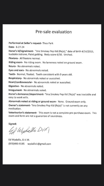 SUBASTA EN LÍNEA Realice sus pujas en www.PlatinumEquineAuction.com Oferta inicial $3500 La subasta finaliza el 17 de noviembre de 2024 ¿Necesita una silla nueva? ¡Echa un vistazo a White Rock Saddles en nuestro sitio web o Facebook! IMA SMOKEY PEP KID alias Rojo. ¡Rojo es el verdadero negocio! De pie justo debajo de 16 manos, tan fornido como vienen y muy atlético (y impresionante) este caballo puede ir absolutamente cualquier dirección que usted quiere llevarlo. Rojo ha estado en nuestro programa de lecciones desde que se inició como un niño de dos años de edad y ha estado en un millón de senderos dentro y fuera del estado con todos los niveles de los jinetes, que se hará cargo de un niño pequeño a caballo a la derecha a través de la ciudad, pero también puede tomar en terreno áspero de montaña con un montón de territorio accidentado. Es 100% seguro con el tráfico, no se asusta ni hace nada raro, no tiene problemas con perros, cochecitos, multitudes, lo que sea. ¡Incluso lo hemos llevado al centro a cenar antes! Rojo es un acabado 2D/3 / D barril caballo, así, a pesar de que no es actualmente las piernas hacia arriba, él tiene un patrón hermoso y sería fácil volver a ella. Rojo l tiene un montón de entrenamiento en el placer occidental y el mundo de reining, tiene un trote lento y lope, pivotes limpias, pases laterales, cambios de plomo volar, rollbacks etc. Rojo ha demostrado en el reining, el placer occidental, y la versatilidad rancho, así como competir en carreras de barriles, rancho tipos y un par de competiciones de trail. (también hizo 2 años de montar a caballo truco y enseñó a saltar en él) Además de eso, Rojo tiene doma y salto de formación. Ha saltado 2'6 constantemente y ha subido a 3'6″ con un montón de alcance y espacio para ir más alto. Rojo va a cruzar cualquier cosa que usted pone delante de él y se amoldará a cualquier nivel y la edad jinete que está emparejado con. ¡También ha tenido un montón de trabajo en libertad, va a hacer círculos en libertad dentro y fuera de la arena o hacer un patrón showmanship todo sin un cabestro! También puede montar sin brida con una cuerda en el cuello y todavía puede ejecutar hermosas paradas, giros y vueltas atrás. No está atado al rebaño o al establo, sale solo o en grupo y se lleva bien con yeguas o castrados. Siempre ha sido sano y saludable sin lesiones o problemas de salud, así como descalzo. Rojo ha sido atado en el rancho, arrastrado ganado, es rápido en el corral de clasificación y aunque no hemos hecho mucho de él, sobresaldría en el corral de corte con su atletismo extremo El padre de Rojo fue MUY exitoso en el mundo del espectáculo y Rojo sobresaldría yendo en esa dirección, o tiene el cerebro perfecto para ser una montura confiable para toda la familia, ¡o ir a correr barriles en él! Es alto, llamativo, inteligente y muy divertido. Es uno de los caballos más graciosos del establo y se lleva bien con todo el que lo ve. Ven a conocerlo y ver por ti mismo. ¡No tenemos ninguna duda de que se enamorará! Situado en Fort Collins, CO. Póngase en contacto con Thea con Dynamite Horses 970-632-3644 con cualquier pregunta. SUBASTA EN LÍNEA Coloque sus ofertas en www.PlatinumEquineAuction.com Oferta inicial $ 3500 Subasta termina el 17 de noviembre 2024 ¿Necesita una silla de montar nueva? ¡Echa un vistazo a White Rock Saddles en nuestro sitio web o Facebook!