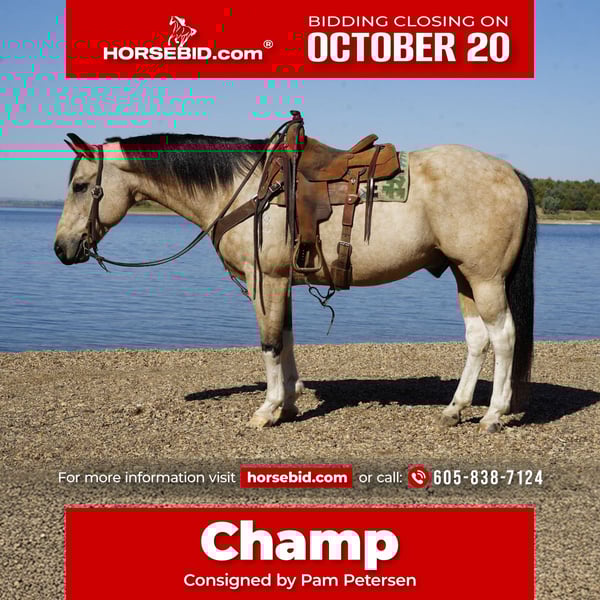 ♦️ 𝐭𝐡𝐞 𝐀𝐌𝐄𝐑𝐈𝐂𝐀𝐍 𝓕𝓪𝓵𝓵 𝓒𝓵𝓪𝓼𝓼𝓲𝓬 ♦️ Happening now thru MONDAY | OCTOBER 20th - Available EXCLUSIVELY on HorseBid's website! For more details and to register visit: www.Horsebid.com CONSIGNOR CONTACT: Pam Petersen 605-838-7124 LOCATION: Corsica SD BREED: Paint REGISTERED: No COLOR: Buckskin paint HEIGHT: 15.1 AGE: 11 GENDER: Gelding Champ is a trail horse deluxe, he has been hauled all over the county to trail riding parks camping, he is gentle and safe for all ages and levels to get along with, no silly business about him, rather go slow but moves out good when asked. He has a great personality loves attention and is good with other horses good to catch, good for farrier and vet, a nice all around family safe trail horse. Call or text 605-838-7124