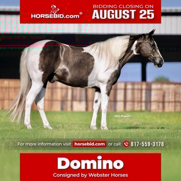 ⭐️ 𝐀𝐔𝐆𝐔𝐒𝐓 𝓐𝓵𝓵 𝓢𝓽𝓪𝓻 𝓛𝓲𝓷𝓮𝓾𝓹 ⭐️ Happening now thru MONDAY | AUGUST 25th - Available EXCLUSIVELY on HorseBid's website! For more details and to register visit: www.Horsebid.com CONSIGNOR CONTACT: Webster Horses 817-559-3178 LOCATION: Springtown TX BREED: Paint REGISTERED: No COLOR: Black and White Tobiano HEIGHT: 14.2 AGE: 13 GENDER: Gelding Domino is a beautiful black and white paint gelding standing 14.2hh and 13yo. Domino is built stout and has great bones and feet. He is 100% sound and sane. Domino is the perfect family gelding if you’re looking for that safe gentle gelding for everyone. Domino has seen all the sights. Ridden in town, by traffic, ridden in the river, crosses any obstacle/log, and is very easy to do all of this one handed. Domino will w/t/c both ways and will neck rein around. He is tried and true as a trail gelding. He is extremely easy. No maintenance, stands to be saddled, groomed, bathed. Loads in the trailer great and backs out. He stands tied quietly, and is a been there done that type of guy. Domino will ride out alone or with a buddy. He is exactly as you see in the video. He is also good with other horses turned out in a pasture. Very easy going gelding. Domino is sound and healthy, he is UTD on teeth floating, deworming, coggins, health, and shoeing. If you have any questions at all text Olivia at 817-559-3178. Domino is located in Springtown TX. Shipping can be arranged anywhere.