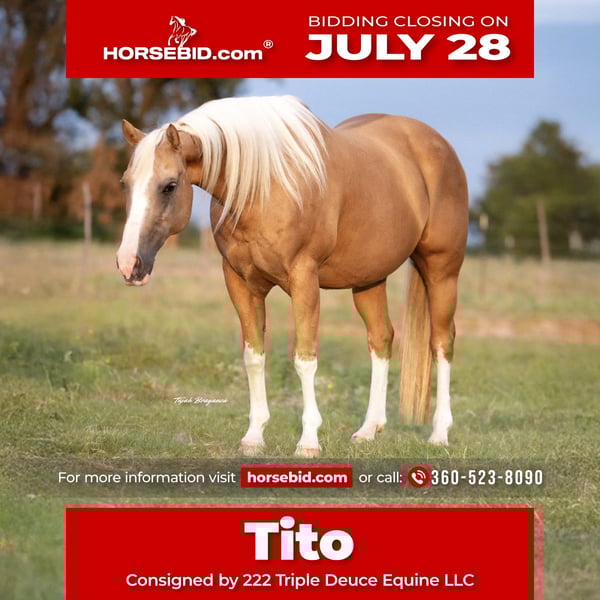 ⚔️ The HORSEMAN's Select ⚔️ Happening now thru MONDAY | JULY 28th - Available EXCLUSIVELY on HorseBid's website! For more details and to register visit: www.Horsebid.com CONSIGNOR CONTACT: 222 Triple Deuce Equine LLC 360-523-8090 LOCATION: Cisco, TX BREED: APHA REGISTERED: Yes REGISTERED NAME: One Hot Fancy Spark COLOR: Palomino HEIGHT: 14.3 AGE: 15 GENDER: Gelding Introducing "One Hot Fancy Spark," also known as Tito. A well bred flashy gelding that goes back to the famous sire “Shining Spark”. Tito is a well-rounded gelding full of potential! He is gentle and suitable for riders of all experience levels, having excelled in various disciplines including trail riding, hunting camps, and even pleasure riding. His extensive resume includes participation in numerous rodeo grand entries and carrying flags for rodeo queens. Tito is also great with cattle and has experience in sorting and ranching. With a calm and easygoing disposition, he possesses more "whoa" than "go." In previous years, Tito has also competed in barrel racing. If you're searching for a safe, all-around gelding with a friendly temperament, Tito is the perfect choice! Please take the time to watch all the videos and see for yourself what Tito can do! We encourage buyers to come see for themselves to get the full effect. If I missed anything you'd like to know more about, feel free to give me a call at 360-523-8090. I can answer all your questions; I want to ensure we make a perfect match! Thank you, and best of luck! ~ 222