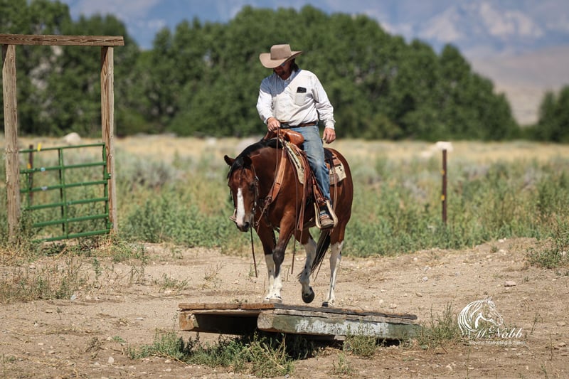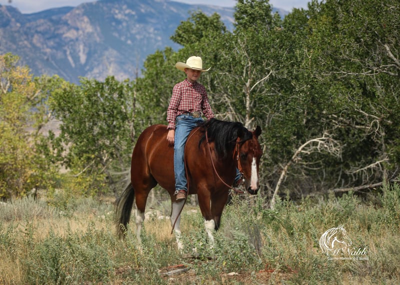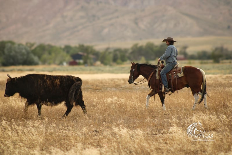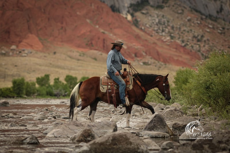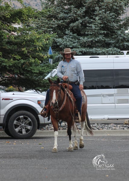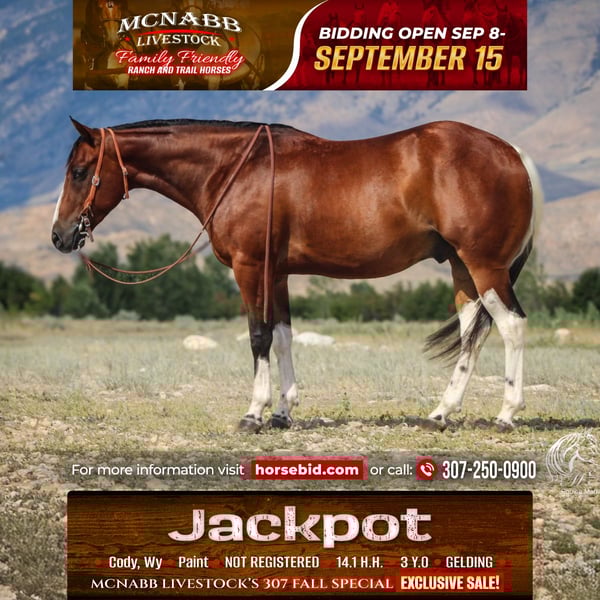 𝕄ℂℕ𝔸𝔹𝔹 𝕃𝕀𝕍𝔼𝕊𝕋𝕆ℂ𝕂's 🍂𝟑𝟎𝟕 𝐅𝐀𝐋𝐋 𝑺𝒑𝒆𝒄𝒊𝒂𝒍🍂 Happening now thru MONDAY | SEPTEMBER 15th - Available EXCLUSIVELY on HorseBid's website! For more details and to register visit: www.Horsebid.com CONSIGNOR CONTACT: McNabb Livestock LLC 307-250-0900 LOCATION: Cody, Wy BREED: Paint REGISTERED: No COLOR: Bay Tobago HEIGHT: 14.1 AGE: 3 GENDER: Gelding Jackpot is absolutely the best minded young horse we have the privilege of having in our program. He is just naturally so smart, sweet, kind and has a gentle demeanor all the time. Our neighbor purchased him as a yearling from the breeder. We fell in love with him and bought him from them as a 2yr old. He was lightly started at 2, trail rode all over the mountains, then broke to drive and this year we have been doing ranch work with him and he has taken everything is stride. He has never been spooky or offered to buck. This fall we have allowed our 4yr daughter to ride him in the indoor arena, we are not selling him as a beginner’s kids horse but he sure has the mind and the right disposition to be one in a few years. Our 11yr son rides him everywhere bareback. Jackpot is super smooth to ride, naturally low headed. Soft in the bridle. He lopes pretty circles, knows his leads, has a good stop and turn around. Jackpot is sweet, kind and loving. He’s in-your-poctet but has lots of manors and is very polite. He has no vices or bad habits. He will ride out alone or he’s happy in a group. He has everything going for him. Excellent conformation, soft kind eye, gentle disposition, with the right amount of chrome to make him flashy. He has had a basic PPE, up to date on worming, dental and farrier. We welcome you to do your own PPE and to come to the ranch a to meet Jackpot. We also are glad to help arrange transportation. We will hold the horses at no charge for a reasonable amount of time to get hauling arranged. For more information call 307-250-0900.