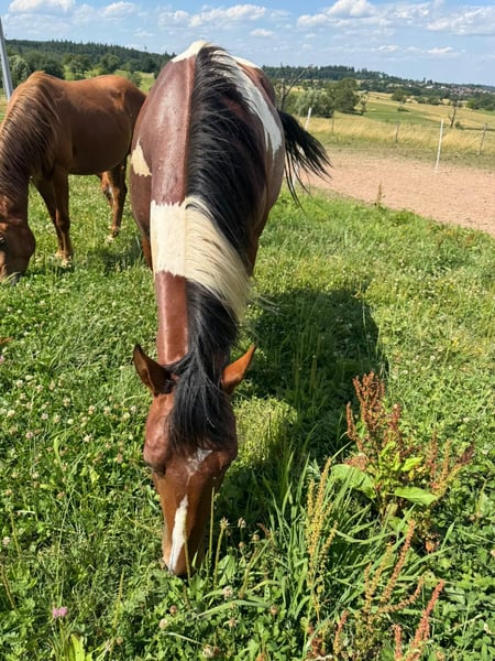 SW Monty Magic Moon – an expressive, beautifully marked Paint Horse gelding, born in 2023, with a final height of 15.0 hh, seeking new challenges. He grew up in a herd with peers and is now ready for exciting adventures. He loves to explore and investigate new surroundings. Character-wise, the stallion is open-minded, playful, and sometimes a little cheeky, but well-behaved when handled. He is halter-trained and knows everything that is expected of a horse his age. Monty has a solid build with strong bones. He is a stunning, movement-rich all-rounder who will excel in any discipline later on, whether in competition or leisure riding. He holds full APHA registration papers.
