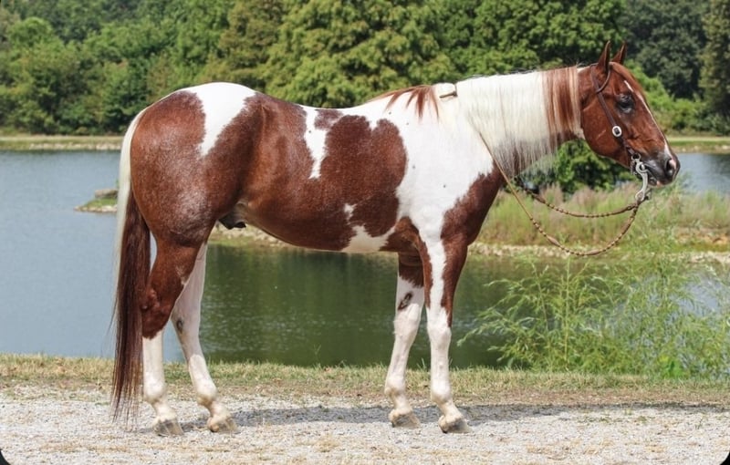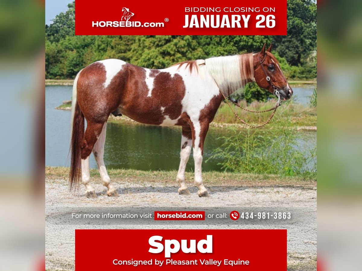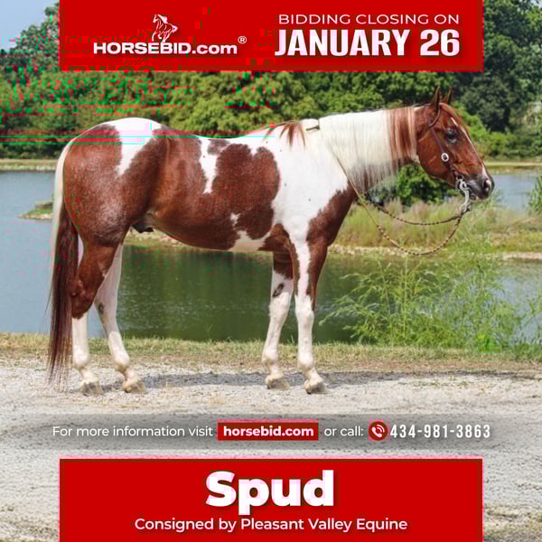𝐉𝐀𝐍𝐔𝐀𝐑𝐘 ⭐️𝑨𝒍𝒍 𝑺𝒕𝒂𝒓 𝑳𝒊𝒏𝒆𝒖𝒑⭐️ Happening now thru MONDAY | JANUARY 26th - Available EXCLUSIVELY on HorseBid's website! For more details and to register visit: www.Horsebid.com CONSIGNOR CONTACT: Pleasant Valley Equine 434-981-3863 LOCATION: Robards, KY BREED: APHA REGISTERED: Yes REGISTERED NAME: I Rigged The Words COLOR: Tobiano HEIGHT: 15.2 AGE: 5 GENDER: Gelding Check out this big, beautiful, broke gelding we call Spud! Spud aka “I RIGGED THE WORDS” is a flashy sorrel tobiano gelding standing at 15.2H weighing 1100lb. Spud is ready to go in any direction you want! Whether you’re looking for a lifelong trail mount, a promising show prospect, or a fun relaxing ride at home, Spud is up for the task! This guy is full of personality and is as easy going as they come! We’ve rode spud through traffic, by a moving train, shot off guns, and so much more. Seriously, nothing bothers this guy! Check out spuds video to really see what all he can do! Talk about a flashy gelding- this guy turns heads everywhere he goes! Not only does he look good sitting out in the field but he’s a pretty mover too! Spud has a correct foundation under his belt. He’ll walk, trot, and canter inside or outside the arena, gives to the bit laterally and vertically, stops, backs, and is simple to ride! He has also been started on show maneuvers and over fences. Spud is extremely versatile and could excel in many different disciplines such as hunter jumper, English eq, fox hunting, mounted shooting, ranch riding, horsemanship, etc. The sky’s the limit with this guy! Spud is very easy going and will ride off the same after having time off. He’s the first one to meet you at the gate and does well living inside or outside. He stands well to be bathed, saddled, shod, clipped, etc with no issues! Spud has no vices and requires no maintenance. He is UTD on vaccines, dental, coggins, worming, and shoes. If you have any questions or want to meet Spud please call or text Jessica at 434-981-3863