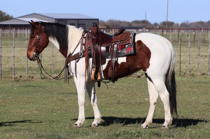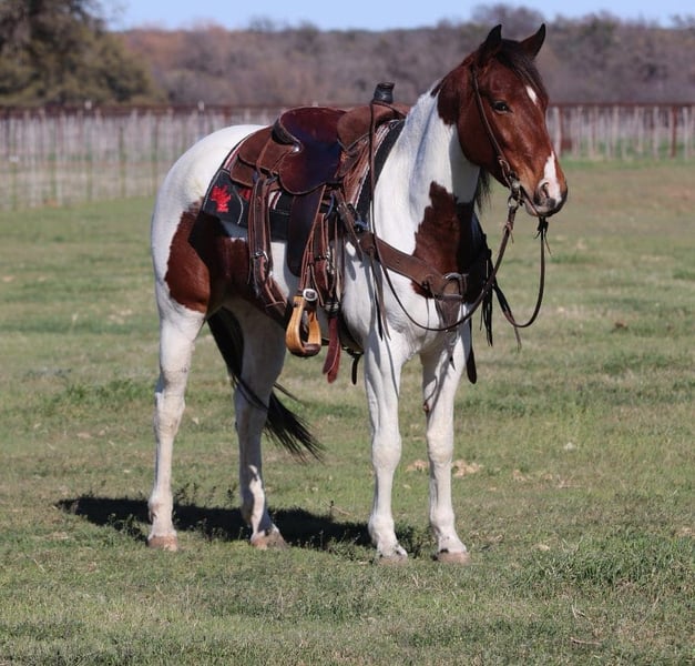 ONLINE AUCTION Place your bids at www.PlatinumEquineAuction.com Starting Bid $3500 Auction ends April 6th, 2025 Need a new saddle? Check out White Rock Saddles on our website or Facebook! How about this gorgeous gal? Loca is a finished heel horse, great trail horse, and just an all around fun mare to have in the barn! She is just 6 years old and 14.2hh tall! Loca is very handy broke, has a nice turn around, big stop and super light in the face! She moves off your legs and lopes around smooth as butter right out of her tracks. She will carry flags, is good in traffic and on roads/highways. We hauled her to the famous Fort Worth Stockyards to ride her through the busy day downtown there and she didn’t ever have a care in the world, was just happy to be there! She is turned out with other mares and geldings, low on the pecking order and gets along with everyone. She also does very good stalled and eats and drinks well on the road. She stands to be saddled, stands good for the farrier and vet, and is easy to catch! Loca is a clean slate ready for anyone to use! We are located in Lipan Texas and have hauling available anywhere in the U.S., Hawaii or Canada! Don’t miss out on the gorgeous paint mare! Please call or text Makenna Hartzell 817-659-3778 with any questions. ONLINE AUCTION Place your bids at www.PlatinumEquineAuction.com Starting Bid $3500 Auction ends April 6th, 2025 Need a new saddle? Check out White Rock Saddles on our website or Facebook!