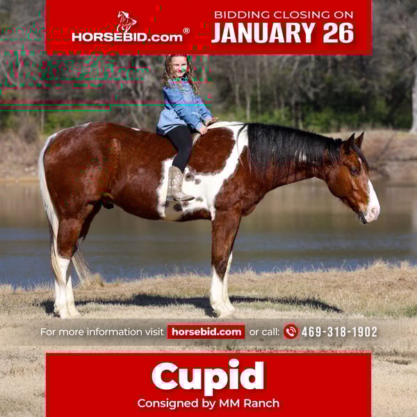 𝐉𝐀𝐍𝐔𝐀𝐑𝐘 ⭐️𝑨𝒍𝒍 𝑺𝒕𝒂𝒓 𝑳𝒊𝒏𝒆𝒖𝒑⭐️ Happening now thru MONDAY | JANUARY 26th - Available EXCLUSIVELY on HorseBid's website! For more details and to register visit: www.Horsebid.com CONSIGNOR CONTACT: MM Ranch 469-318-1902 LOCATION: Forney, TX BREED: APHA REGISTERED: Yes REGISTERED NAME: A LAZY LUVER COLOR: Bay Tobiano HEIGHT: 15.2 AGE: 6 GENDER: Gelding Just in time for Valentine’s Day!!! 💝This is a really fancy double registered tobiano paint gelding!! This amazing gelding is a grandson of the famous Lazy Loper. This amazing gelding is ready to put someone in the winner circle. ❤️🔥Meet “A Lazy Luver” his barn name is Cupid!! This is a stunning 6 yr old 15.2 hands tall bay and white paint gelding. He a grandson to the one and only superior western pleasure and leading producing stallion, Lazy Loper! Cupid has several other amazing winners on his papers too. He is bred to be an outstanding show horse. He has an excellent foundation in his training. He has all the bells and whistles in his training. He has been very well started and lightly shown in the western pleasure classes and the ranch and the trail courses. He is extremely honest and willing to please. He is naturally bred to be quiet and easy going. From his jog to his silky lope to his super easy transitions. He packs his head low and level without any fuss or resistance. Can be rode both western or English. He shows a lot of potential to be an amazing jumper or hunt seat. He is a very elegant pretty mover. And so easy to sit and ride. He would be a blast to show. 💗He is also amazing out on the trails and riding through town! He is not at all spooky or bothered by things like wildlife or common things one might see on a trail ride or in town. Like traffic, bikes, motorcycles, lots of people. He quiet riding anywhere in the pack and he stands tied at the trailer for tacking and untacking like a perfect gentleman. Absolutely no bad habits whatsoever!! You do not have to warm him up or tune him up to go for a ride. He is easy and fun to ride. 💞No matter which direction you decide to take this handsome boy he is ready and willing. At just 6 yrs old he has his whole life ahead of him. I would absolutely say he is suitable for any level and any age rider. From children to adult beginners all the way up to an advanced rider. This gelding has been nothing short of amazing for us. Plus the best part is he has the most amazing, in your pocket personality with an "old soul" disposition! He loves people and attention. Loves kisses and muzzle scratches. He will lay his head on your chest and just close his eyes getting loved on! If ever there was a young horse suited for a child to ride and show.. this would be him! He is naturally bred with a little more whoa than go. I have never seen him get hyped up or excited over anything. 🩷He is a super easy keeper. Requires no maintenance of any kind. He can go bare foot or put shoes on him. You can stall him or turn him out. Doesn’t matter to him. He is easy. PLUS he sells 100% sound with no issues. He did have a pre vet evaluation done included in the pictures. If you have anymore questions about him feel free to call. We would love to visit with you about him. We can help you arrange fast affordable shipping anywhere. He is up to date on all vaccinations, worming, had his teeth checked, feet. He is ready to go to his new home.