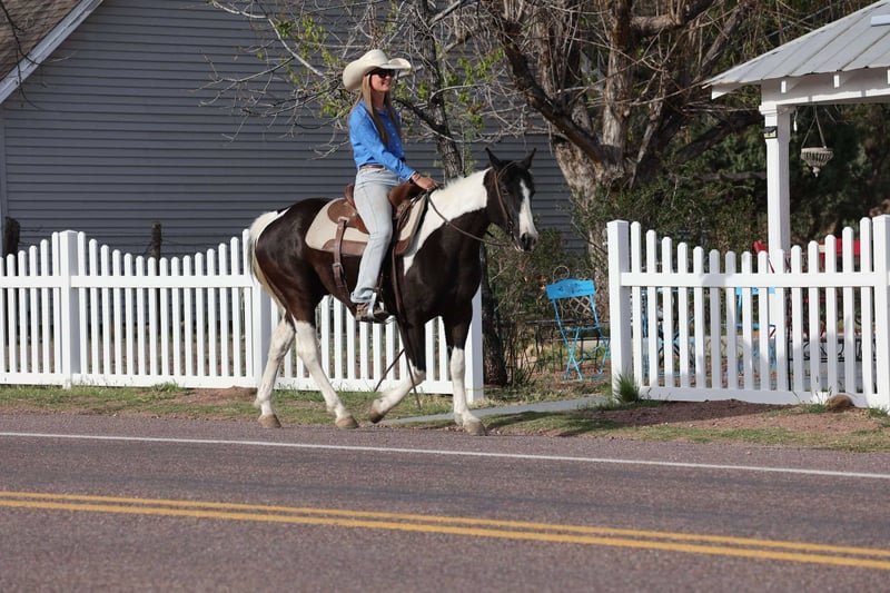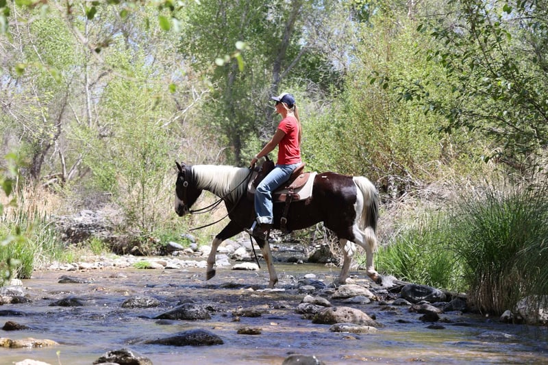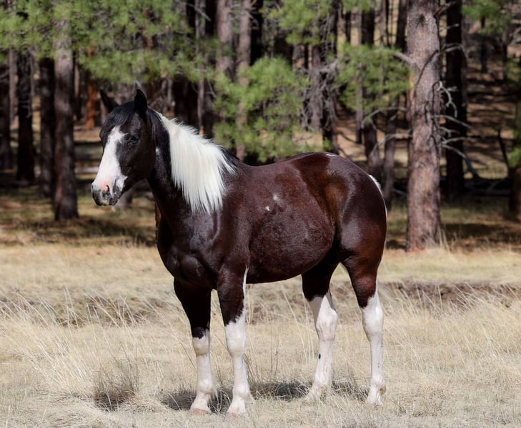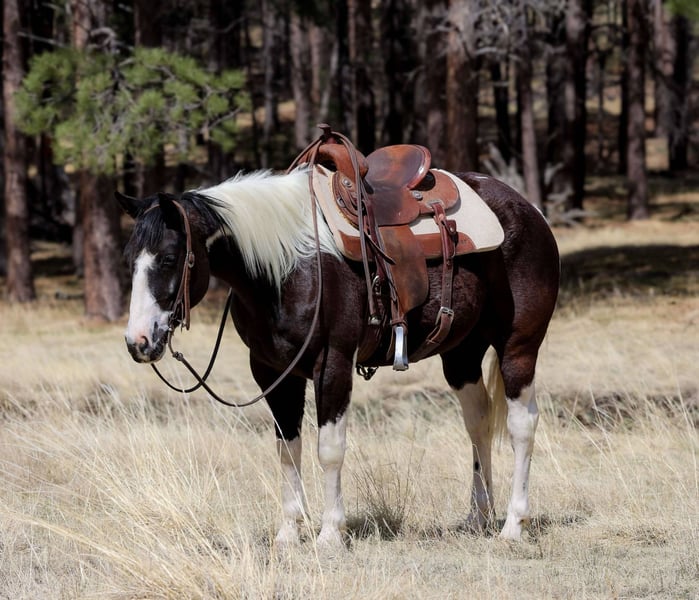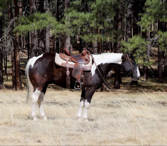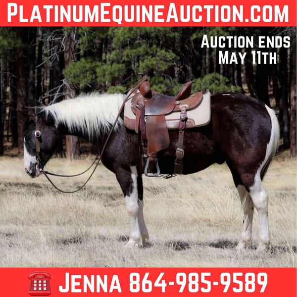 ONLINE AUCTION Place your bids at www.PlatinumEquineAuction.com Starting Bid $3500 Auction ends May 11th, 2025 Need a new saddle? Check out White Rock Saddles on our website or Facebook! Doc Holiday is a 5 year old grade gelding standing 14.2hh. This sweet paint is just as fun as he is cute!! With his willing young mind, this gentle boy will take you anywhere with ease! From flowing rivers, to broken logs, thick brush or rough terrain, you can trust Doc to take you there safely! His talent doesn’t stop at trails, he’s also a sweetheart in the arena! He will walk, trot, lope beautifully for you! You can also rely on him to take you through town without even thinking! Loud sirens, big buses, semis, bikers, joggers and dogs, you name it and he handles it! And he is a blast to gather cows on gathers! He also stands wonderfully for baths, saddling, shoes, bridling, grooming, or even just hanging out! He loads wonderfully on the trailer too! He will come with a clean health and coggins! I can help with transport to anywhere in the US! Located in Cottonwood AZ. Contact Jenna Edwards 864-985-9589 with any questions. ONLINE AUCTION Place your bids at www.PlatinumEquineAuction.com Starting Bid $3500 Auction ends May 11th, 2025 Need a new saddle? Check out White Rock Saddles on our website or Facebook!