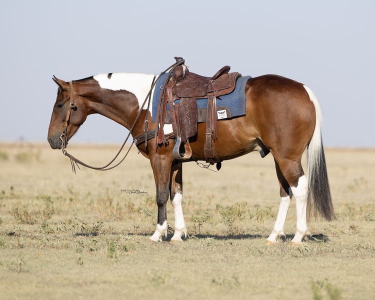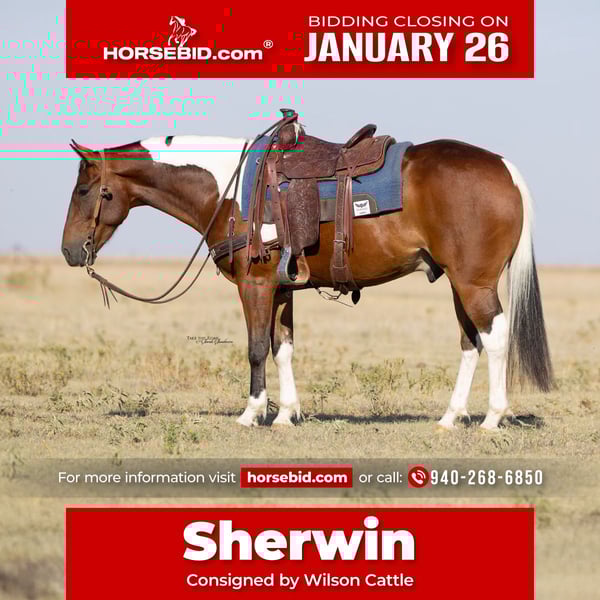 𝐉𝐀𝐍𝐔𝐀𝐑𝐘 ⭐️𝑨𝒍𝒍 𝑺𝒕𝒂𝒓 𝑳𝒊𝒏𝒆𝒖𝒑⭐️ Happening now thru MONDAY | JANUARY 26th - Available EXCLUSIVELY on HorseBid's website! For more details and to register visit: www.Horsebid.com CONSIGNOR CONTACT: Wilson Cattle 940-268-6850 LOCATION: Congress, AZ BREED: APHA REGISTERED: Yes REGISTERED NAME: Spooncat Strait Smoke COLOR: Tobiano HEIGHT: 15 AGE: 7 GENDER: Gelding Sherwin is a cool moving, cool looking, same day-in-day out kind of horse. He is one that is very easy to be around. We have given Sherwin ample time off and he does not change one bit. I have never seen this horse ever hump up or even feel the slightest bit of tight. We have done everything you can do on him from ranching, heading, to heeling you name it and he can do it. Sherwin is broke, he will ride and slide. On top of that, he will watch a cow. On the head side he has the fancy move that we love and will face. Sherwin is one of the most photogenic heel horses we have ever had, making that heel shot really spark behind the camera. He stops deep, square and solid with a great finish, never budging. As much as he likes to stop, he is free enough that he never takes away your throw away. We have rode Sherwin a lot outside and he is really fun. Nothing at all bothers him and he is dependable day in and day out. The cow horse his pedigree comes out when you put cattle in his line of sight; he is fun to sort on and is great at dragging calves. We have had Sherwin in Arizona the last 2 winters with us. Rodey hauled and won on him at different jackpots including the Texas Title Fights. Brooke has hauled him on the head side as well. If anyone shows up wanting to rope with us we always know Sherwin is a good go-to horse. Sherwin is easy to catch, shoe, bathe, haul and everything else in-between. Sherwin stands 15 hands tall and will weigh 1200 pounds. Please watch his video and we will let it do the talking for him! We want to personally invite you to come try Sherwin! We welcome additional prepurchase exams as well. Please call us with any questions.