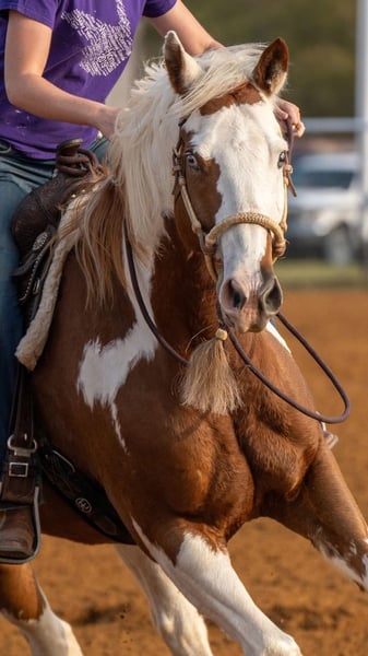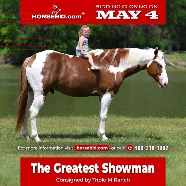 ▪️▫️◾️𝐭𝐡𝐞 𝑴𝒂𝒚 𝐒𝐞𝐥𝐞𝐜𝐭◾️▫️▪️ Happening now thru MONDAY | MAY 4th - Available EXCLUSIVELY on HorseBid's website! For more details and to register visit: www.Horsebid.com CONSIGNOR CONTACT: Triple M Ranch 469-318-1902 LOCATION: Talty, TX BREED: Paint Horse REGISTERED: No REGISTERED NAME: The Greatest Showman COLOR: Sorrel Overo HEIGHT: 15.2 AGE: 7 GENDER: Gelding 🎪“The Greatest Showman”!!!🎪 Yes named after one of my favorite movie. If you haven’t seen it you should watch it. 🤹🏻The Greatest Showman is a gorgeous red and white paint gelding with the most striking face markings and blue eyes. Yes both eyes are crystal blue. He is very unique horse all the way around. They don’t make them like him everyday. With Showman you can take to the shows or hit the trails. You will truly enjoy him. He is hands down a perfect all around family horse!!!! One that is bombproof and safe for anyone to ride!!! Let me say it again, he is SAFE for anyone to ride. He is at the perfect age of just 7 yrs old. (Yes vet confirmed to be that age.) So he has his whole life ahead of him. He stands 15.2 hands tall. 👉🏼SHOW EXPERIENCE: Showman is a natural in the show ring. Very comfortable. Acts the same away from home as he does at home. He's been shown at the local shows in western pleasure classes, ranch trail classes, reining classes, the working cow horse, and even done a little barrel racing. Showman is the type you can learn on but also win on. He's responsive to your seat and leg but not overly responsive or overly sensitive. He will go just as fast or as slow as you'd like. He has got that comfortable western pleasure rocking chair lope, he does automatic lead changes, has an easy stop, and turns around correct and pretty. He has all the fancy bells and whistles. He was trained correct with a solid foundation. Plus he will really stands out in the show ring. You will get noticed riding him!! 👉🏼ENGLISH EXPERIENCE: Showman also rides English and goes over the jumps. He's so open minded and willing you could take him to the hunter classes and really hold your own! He packs his head low and correct and goes right to the jumps! Very pretty mover. 👉🏼TRAIL EXPERIENCE: Showman loves to trail ride!! Down the road, through the woods, or take him swimming! He loves going new places!! He doesn't mind traffic, dogs or wildlife. He goes up and down the big hills carefully and easily. He goes right into the water! He loves to play and splash in the river! He will ride front, middle or back of the pack. Not at all buddy soured if you like going out on the trails alone. You can rest assured if you go out by yourself you will be okay and enjoy your ride. 👉🏼DISPOSITION: Showman is extremely sweet and loves being loved on. He comes right to you and puts his head in the halter. He loves kisses and having his ears scratched. Showman is very quiet and easy to ride and be around. He's got a very go with flow way about him. He doesn't get upset when his rider gets off balance or in his face. He's very forgiving if you mess up or give the wrong command. He would really make an excellent addition to a lesson program or just a casual rider wanting a very broke horse to enjoy! 👉🏼UPKEEP: Showman is an easy keeper. He's currently eating alfalfa hay. He is UTD on everything and currently barefoot. He doesn’t require shoes but very easy to shoe if you want him shod. Has good solid feet. We just put shoes on him if we planned to ride him on long rocky trail ride. If not he stays barefoot here. 👉🏼LOADING: Showman loads and hauls like a dream. Very quiet and patient in and out of the trailer. He stands quietly tied to the trailer at the horse shows. No pawing or throwing a fit if left alone either. So makes it so easy if you want to go to the shows or trail rides with just one horse. 👉🏼TURNOUT: Showman he can be by himself or in a group in the pasture. We've had him out with mares, geldings, mini ponies, mini cows, mini donkeys, etc.. without any fussing or drama. He is in the middle of the pecking order. Gets along with everyone. 👉🏼GROUND MANNERS: He is great on the ground. Respectful of personal space. He stands like a dream for grooming, washing, saddling, mounting block and he takes the bit easily. He will stand single tied and crosstied. Doesn't mind dogs, goats, small children around his feet. 👉🏼BAD HABITS/ VICES: Showman has absolutely NO bad habits or vices. Absolutely no buck, no rear, no bolt, no bite, or no kick. I cannot say it enough, this horse is a saint!!! He does not need to be warmed up or tuned up before you can go for a ride either. You can catch him straight out of the pasture and get on him. Even if it has been a few months since you rode him last. That’s a big plus in our books. Cause life gets busy and sometimes hard to make time to ride everyday. With him you don’t have to worry about that. 👉🏼TACK: We've ridden Showman in anything from a halter and lead rope to a snaffle to a correction bit. Our go to bit of choice for him is a medium shank snaffle. English, western, bareback, backwards, sideways, forward, doesn’t matter to him. As long as he is getting attention from you he is happy!! 👉🏼SHIPPING: We can and will help arrange affordable shipping anywhere. He is up to date on all shots, feet, teeth, etc.. He is 100% sound, fit, and ready for his new home. We did have a pre evaluation done by our vet.(included in the pics). Absolutely nothing wrong with the amazing horse. Call us anytime if you would like to visit with us about Showman.