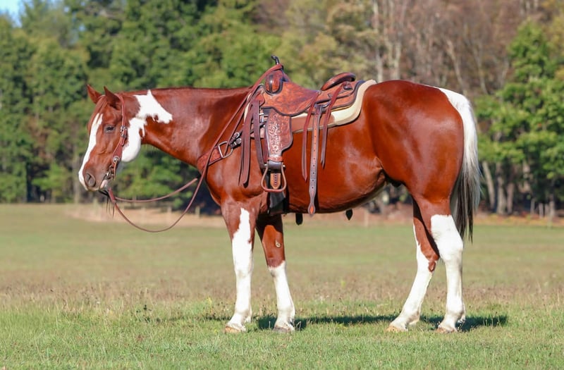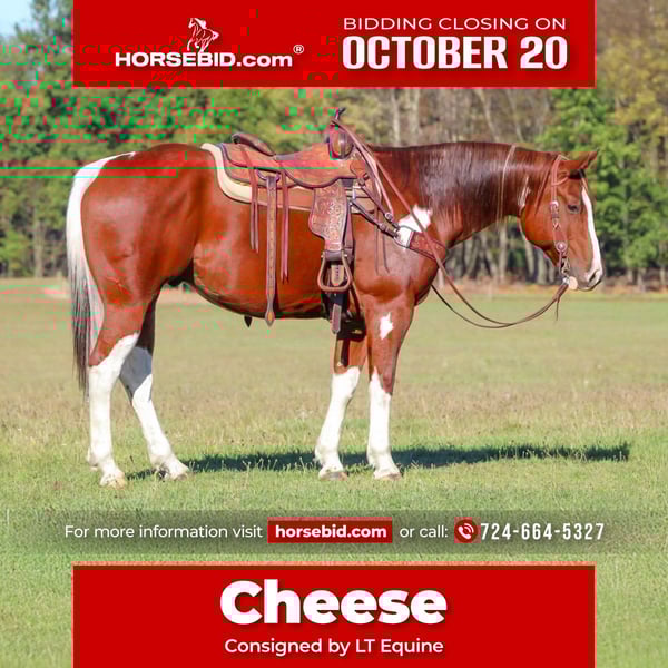 ♦️ 𝐭𝐡𝐞 𝐀𝐌𝐄𝐑𝐈𝐂𝐀𝐍 𝓕𝓪𝓵𝓵 𝓒𝓵𝓪𝓼𝓼𝓲𝓬 ♦️ Happening now thru MONDAY | OCTOBER 20th - Available EXCLUSIVELY on HorseBid's website! For more details and to register visit: www.Horsebid.com CONSIGNOR CONTACT: LT Equine 724-664-5327 LOCATION: Miola PA BREED: APHA REGISTERED: Yes REGISTERED NAME: Sweet Cheesus COLOR: Chestnut and white paint HEIGHT: 15.3 AGE: 7 GENDER: Gelding Introducing “Sweet Cheesus” yes, that’s his real name! We call him The Big Cheese or just Cheese! 🧀 Not only does he have the coolest name he’s the coolest horse to boot! He has the most unique markings around! If your wanting a horse that’s catches everyone’s attention he’s your guy! He’s a big thick built horse with solid legs and feet to last. Standing approximately 15.3+, he has a very defined head and jaw that makes his looked even more attractive. Cheese is very well bred going back to the famous INVITATION ONLY ( an all time leading sire of point earners, 2008 NSBA Halp of fame Indcutee, amongst many other accomplishments) Cheese has that natural western pleasure breeding quietness and level headed when riding. Though he’s not a finished western pleasure horse he would go into a show ring and do well he’s the type of horse that is cool with whatever you throw at him. I just use Cheese as a trail horse, I guide large groups of riders on trail rides all over the forest. He’s fantastic in large groups, lead or follow, or out alone. He’s not spooky, and has a very good mind. Cheese neck reins, has a nice deep stop, easy smooth trot, slow lope picking up both leads, he’ll side pass and backs up nicely. Cheese would also make a nice English horse as well or a lesson program horse. He is super safe. He’ll go down through water and mud holes, up over mountains and rough terrain. He’s been packed down with saddle bags, and tied to trees for lunch. He stands nice to mount and dismount with or without the mounting block. You will not be disappointed with The Big Cheese! For any more information please contact me call or text! Thank you! Have a great day.