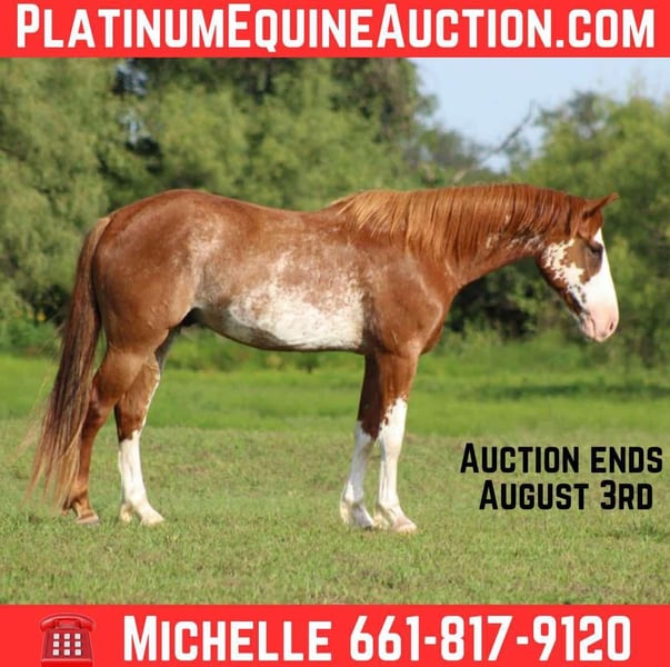 ONLINE AUCTION Place your bids at www.PlatinumEquineAuction.com Starting Bid $3500 Auction ends August 3rd, 2025 Need a new saddle? Check out White Rock Saddles on our website or Facebook Meet Bam Bam, the stunning paint gelding that’s guaranteed to turn heads and leave everyone speechless when you ride by! This gorgeous 8-year-old stands at a perfect 14.3 hands tall and is the definition of seasoned and reliable. Bam Bam has dabbled in just about everything you can imagine! He’s participated in playdays and junior rodeos, knows the barrel and pole patterns, and has even been used for goat tying. He’s a well-rounded ranch horse, helping with all the ranch chores and has been a trusted mount for kids checking cattle and doctoring the sick ones. This handsome fella is no stranger to the spotlight, having carried flags in grand entries at rodeos and made his way through parades, including the recent Fourth of July parade where he proudly ponied two cowboys on their horses! He’s been exposed to bustling crowds, like those in the famous Fort Worth Stockyards, and has handled it all like a champ. When it comes to trail riding, Bam Bam is a blast! He’ll follow wherever you point him—crossing water, logs, and bridges with ease, all while remaining completely unfazed by the various wildlife he encounters. He navigates all types of terrains and is the perfect all-around horse, ready for a hard day’s work or a leisurely ride out in nature. In the arena, Bam Bam moves beautifully, walking, trotting, and loping in perfect circles. The best part? He’s the same perfect gentleman every time, even if he hasn’t been ridden in a while. Always the first to greet you at the gate, he’s a super sweet dude who gets along wonderfully with other horses—currently living with another gelding in his herd. If you’re looking for a laid-back, easygoing partner who’s ready for any adventure, Bam Bam is your guy! Come meet him and see for yourself the charm and character this fabulous gelding has to offer! We are open to anyone interested in him to schedule a time to come see him or if you can’t make it schedule a FaceTime showing to see him. If you need help with transport don’t hesitate to ask we have a list of reputable haulers that can get him safely to your doorstep WORLD WIDE including, Alaska , Mexico, Hawaii, Canada and anywhere in between. For more info contact M$ Performance Horses Michelle 661-817-9120. ONLINE AUCTION Place your bids at www.PlatinumEquineAuction.com Starting Bid $3500 Auction ends August 3rd, 2025 Need a new saddle? Check out White Rock Saddles on our website or Facebook