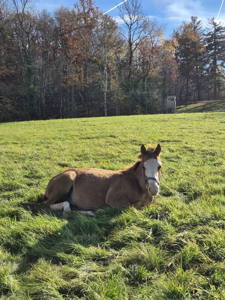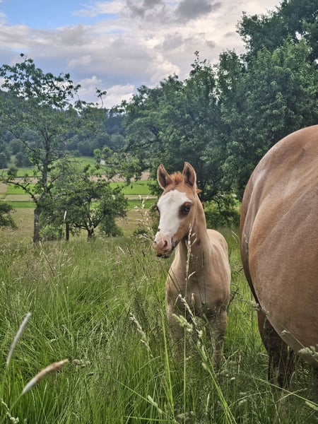 Very expressive, strong colt with an excellent pedigree - suitable for sport and of course also for ambitious leisure riders. Wide blaze. One blue eye. Estimated final height 150cm. Will learn the basics of foal training before leaving. Grows up healthy on our large Black Forest pastures, in a herd. - Stable foundation and strong bones - Good conformation - Cheeky character - Easy to handle - 5 Panel N/N via the parents - CoR AQHA and DQHA passport are applied for **Entering the yard and pastures for viewings, as well as riding the sale horses, is always at your own risk! Exclusion of any warranty! We charge €50 for trial rides of our sale horses. This amount will be deducted from the purchase price of a horse.**