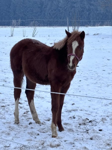 Hot Nite Invitation - ein bildhübscher Quarter Horse Hengst, geboren am 13. März 2025. Mit seiner eleganten sorrel-Farbe, seinem korrekten Gebäude und der harmonischen Bemuskelung ist er ein echter Blickfang. Er wird voraussichtlich ein Endmaß von etwa 160 cm erreichen und damit später auch größere Reiter gut abdecken können. Seine AQHA-Papiere liegen bereits vor. Dieser junge Hengst wächst artgerecht im Herdenverband auf und kennt sowohl Paddock-Box als auch Weide. Er ist altersentsprechend geimpft, regelmäßig entwurmt und an Tierarzt sowie Hufschmied gewöhnt. Hot Nite Invitation zeigt sich stets brav, ruhig und gelassen, dabei aber aufmerksam, lernfreudig und charakterstark. Sein menschenbezogener, lieber Charakter macht den täglichen Umgang mit Rocky zu einer Freude. Auch unter Bewegungsaspekten weiß dieser Youngster zu überzeugen: Er zeigt bereits jetzt schöne, taktreine Grundgangarten und bringt das Potenzial für eine erfolgreiche Laufbahn im Sport oder auf Turnieren mit. Dank seiner erstklassigen Pleasure- und Allround-Abstammung (Hotroddin Invitation x Nite Chip) eignet er sich ebenso hervorragend als zuverlässiger Freizeitpartner. Hot Nite Invitation ist DQHA Futurity startberechtigt, kennt das Fohlen-ABC und ist selbstverständlich halfterführig. Mit seinem hervorragenden Exterieur, seinem angenehmen Wesen und seinem vielseitigen Talent ist er ein echtes Versprechen für die Zukunft - ganz gleich, ob als Showpferd oder treuer Freizeitkamerad. Kann gerne zur Aufzucht bleiben.