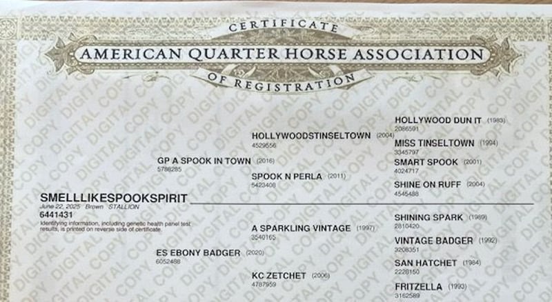 Elite Reining Prospect – Smelllikespookspirit | 6-Panel N/N | EU & DE Genomineerd Exclusief te koop: uitzonderlijk goed gefokt Quarter Horse hengstveulen, geboren op 22 juni 2025. Smelllikespookspirit combineert een bewezen internationale prestatie-afstamming met uitstraling, correctheid en top toekomstpotentieel voor de reining sport en fokkerij. Hij is een zoon van GP A Spook In Town(Hollywoodtinseltown), afkomstig uit twee million dollar sires, wat garant staat voor kwaliteit en prestaties.(Aan grootmoederszijde komt hij uit Spook N Perla, een dochter van Smart Spook(5 million dollar sire). Deze merrie bewees zich op internationaal niveau onder Ann Fonck met sterke resultaten op grote shows.) En zijn moeder is direct A Sparkling Vintage dochter. ✔ Genetisch getest – 6 Panel N/N ✔ Europees & Duits genomineerd ✔ Top prospect voor reining, show en fokkerij Een modern, correct gebouwd veulen met kwaliteit, uitstraling en een uitzonderlijke genetische basis. Serieuze interesse? Neem gerust contact op. Elite Reining Prospect – Smelllikespookspirit | 6-Panel N/N | EU & DE Nominated Exclusively for sale: exceptionally well-bred Quarter Horse colt, born June 22, 2025. Smelllikespookspirit combines proven international performance bloodlines with presence, correctness, and outstanding future potential for the reining industry and breeding. He is sired by GP A Spook In Town( Hollywoodtinseltown), representing quality, and performance at the highest level. (This sire is out of Spook N Perla, a daughter of Smart Spook. His dam proved herself internationally under Ann Fonck, achieving strong results at major shows.) His mother is direct daughter out of A Sparkling Vintage. ✔ Genetic tested – 6 panel N/N ✔ European & German nominated ✔ Top prospect for reining, showing, and breeding A modern, correct colt with quality, presence, and an exceptional genetic foundation. Serious inquiries only.