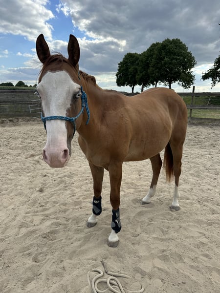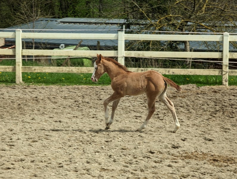 For sale is my Quarter Horse stallion LIL SHOOTIN BUCKAROO “Buck” (Guns R for Shootin x Lil Steppin Chic), born in March 2023. He comes in the rare red dun splash color with two blue eyes and four white legs. Current height: 145 cm NRHA nominated DQHA Foal Show: awarded 1A Premium Foal He has been regularly vaccinated and dewormed. Buck is lightly started under saddle and has extensive groundwork experience. From the very beginning, he has been handled daily and is well accustomed to people. He loads easily, stands perfectly for the farrier, and knows the trails from many walks and a few rides. Character: An absolute sweetheart – even as a stallion, very gentle and easy to handle. He is completely unflappable, truly “bombproof.” He shows the same qualities under saddle: willing, eager to please, and enjoys working. He is used to rider weight, saddle, and lunging in all three gaits, both with and without a rider. His training is ongoing. He grew up in a large herd with both stallions and geldings and is currently turned out with another gelding. Even around mares, his behavior is exceptionally good. Buck shows great potential for Reining and would be a strong prospect for ambitious competitors, but he would also make a reliable partner for leisure riding or could be used as a breeding stallion. More photos and videos available upon request.
