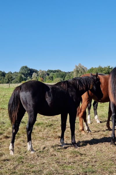 Treats N Diamonds - ein bildschöner, junger Quarter Horse Hengst mit hervorragendem Fundament, kräftigen Gelenken und sehr guter Bemuskelung. Er zeigt sich bereits jetzt weit entwickelt und gesund. Sein korrekter Körperbau, sein harmonisches Erscheinungsbild und seine tolle Farbe (black) machen ihn zu einem echten Eyecatcher mit Zukunftspotenzial - sowohl im Sport als auch im Freizeitbereich. 2024 geboren mit einem Endmaß von ca. 152 cm. Tristan wächst artgerecht in einer Hengstaufzucht auf und ist bestens sozialisiert. Er ist freundlich, neugierig, menschenbezogen und lernwillig. Tierarzt und Hufschmied kennt er bereits, ist halfterführig, altersgemäß geimpft und entwurmt. Seine Abstammung lässt keine Wünsche offen: Er entstammt einer erstklassigen Reining-Linie und ist NRHA Germany einbezahlt. Tristan ist ein Sohn von One Shiney Treat, ein Sohn vom 10,2 Mio Dollar Sire Shining Spark. One Shiney Treats Mutter, HAGANDAZ, ist eine Money earning& producing GRAYS STARLIGHT-Tochter. Sie gewann $49,289 in NCHA & NRCHA Events, und produzierte erfolgreiche Performance Nachzucht, mit insgesamt über $65.616 (NRHA, NCHA& NRCHA). Tristans Mutter, Miss Tiffany Chic, wurde erfolgreich geshowt und ist eine Puro Chic Tochter. Tristans Geschwister aus der gleichen Mutterlinie konnten sich bereits erfolgreich im Reining-Sport (Open) beweisen. Ein aktueller 6-Panel-Test liegt über die Eltern und zusätzlich durch einen eigenen Test vor - er ist N/N. Treats N Diamonds wird mit AQHA-Papieren und Equidenpass abgegeben. Dank seiner erstklassigen Reining-Abstammung und der NRHA Germany Einzahlung stehen ihm alle Wege offen - sei es im Sport, auf Turnieren oder als vielseitiger Freizeitpartner.