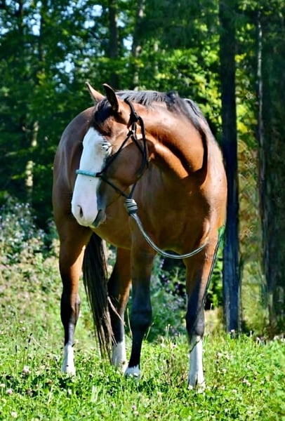 Flashy Gotta Gun - gut gebauter, lieber Quarter Horse Hengst, 2022 geboren mit einem Endmaß von ca. 155 cm, mit super Mind. Er überzeugt nicht nur durch seinen Charakter, sondern auch durch das tolle Reitgefühl, was er einem bietet. Flashy ist immer bemüht alles richtigzumachen, sehr lieb, brav und gut erzogen. Der Hengst wuchs unter besten Bedingungen mit allerbestem Futter und Mineralien auf. Ist 6-Panel n/n. Steht im Offenstall in einer Hengst/Wallach Herde und ist bisher nicht hengstig. Er hat ein kompaktes, kräftiges Gebäude mit toller Oberlinie. Flashy geht unterm Sattel die drei Grundgangarten. Kennt Bodenarbeit und geht sehr brav als Handpferd mit ins Gelände. Letztes Jahr hat er 2-mal gedeckt, 1 Fohlen ist vor Ort zu besichtigen. Der Hengst hat eine sehr gute, alte Reining Abstammung. Sein Vater, Black Gotta Gun, wurde erfolgreich geshowt (LTE: 11.000$). Flashys Mutter ist Raye Peponita gezogen. Bei der AKU zeigten die Röntgenbilder eine leichte Veränderung, weswegen er unter Wert abgegeben wird. Er zeigte nie Lahmheiten etc. und kann als Freizeitpferd genutzt werden.