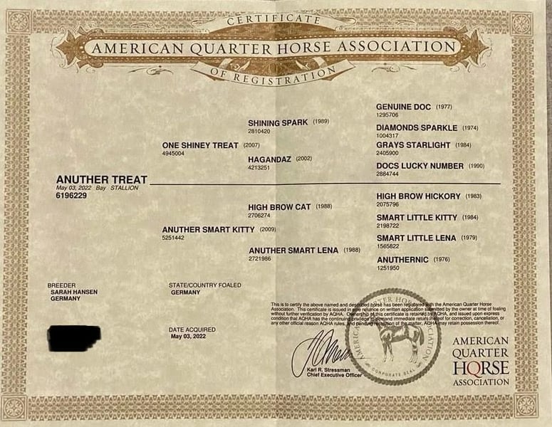 Unfortunately, our young stallion does not reach the desired height for me and so I am looking for a new home for him. He is definitely too good to just stand around and look at! ANUTHER TREAT is a son of ONE SHINEY TREAT born in May 2022 out of ANUTHER SMART KITTY from the successful Hansen Horses breeding program. Full brother of Elsa ;-) full pedigree in the photos! 'Tommi' is 1.40m tall, powerfully built with a strong foundation and a DQHA foal inspection score of 81.89%. 6 panel N/N/ via the parents. He knows ground work, grooming and cleaning, is raw and enjoys his young horse life with his young buddies in an open stable. Perfect raw diamond to shape yourself and start now! Great cowhorse and cutting legends adorn his pedigree and his athleticism and expressiveness of movement give great hope.