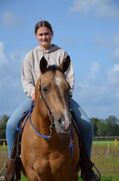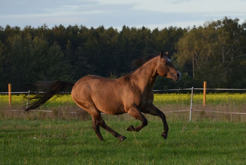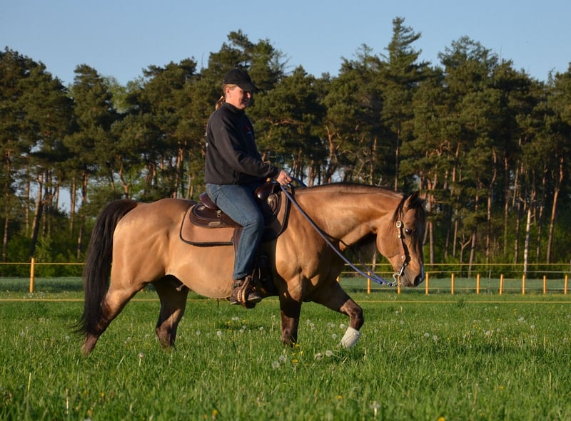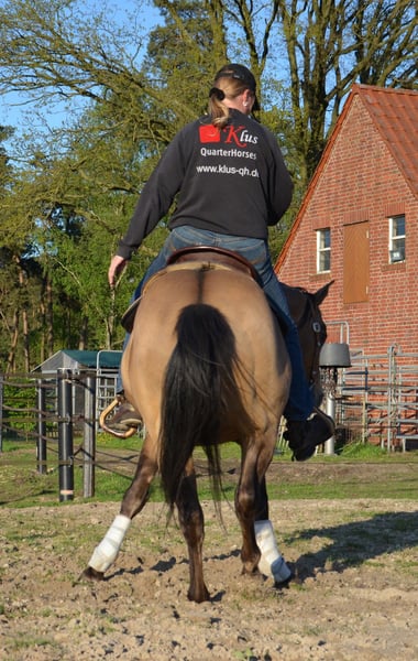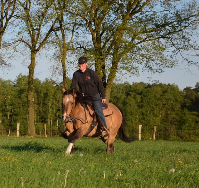 Happy se révèle être un étalon très équilibré. Il a un beau body puissant avec de gros sabots. Comme on peut rêver d'un quarter. En plus, il a les nerfs solides et est très cool. Happy peut être visité avec plaisir. En 2023, il a quitté le sud de l'Allemagne pour venir chez nous. Un candidat étalon des anciennes lignées. Il a encore sailli quelques juments chez nous en 2023 et là aussi, il s'est montré très sociable lors de la saillie à la main en monte naturelle. Nous attendons donc sa première descendance à la ferme dès 2024. Il saillira chez nous à partir de mars 2024 en monte naturelle.