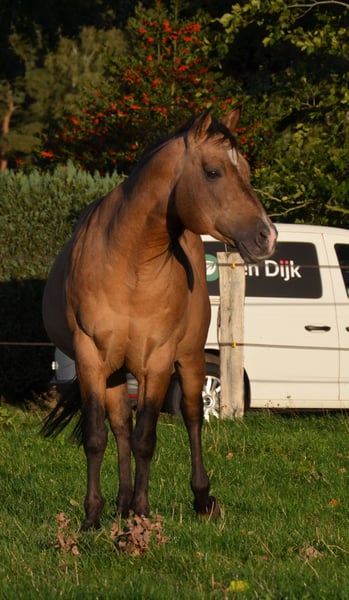 Happy is een zeer evenwichtige hengst. Hij heeft een mooi sterk lichaam met grote hoeven. Precies zoals je zou wensen in een Quarter. Plus sterke zenuwen en koelbloedigheid. Happy is beschikbaar voor bezichtiging. In 2023 verhuisde de good guy vanuit Zuid-Duitsland naar ons toe. Een kandidaat hengst van de oude bloedlijnen. Hij heeft in 2023 nog een paar merries bij ons gedekt en ook toen bleek hij heel makkelijk in de omgang te zijn bij het aan de hand dekken in natuurlijk springen. We verwachten zijn eerste nakomelingen dan ook al in 2024 op ons bedrijf. Hij zal vanaf maart 2024 op onze boerderij op natuurlijke wijze gedekt worden.