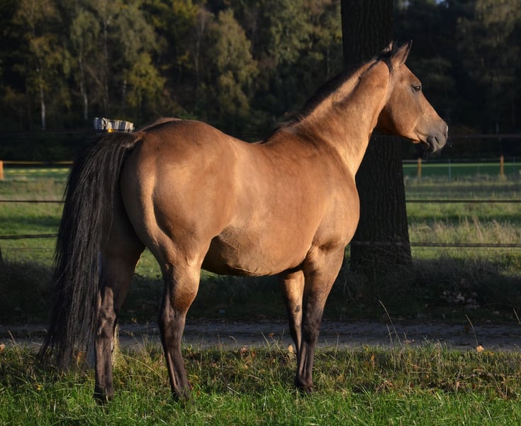 Happy zeigt sich als ein sehr ausgeglichener Hengst. Er hat einen schönen kräftigen Body mit großen Hufen. Wie man sich einen Quarter wünscht. Dazu noch Nervenstärke und Coolness. Happy darf gerne besichtigt werden. 2023 zog der Gute aus Süddeutschland zu uns. Ein bewerter Hengst der alten Blutlinien. Happy deckt brav im Natursprung an der Seine Nachzuchten können sich sehen lassen. Sie bestechen durch ihr gutes Fundament und dann meistens mit Sonderfarben. Aktuelle ein smoky grullo, dunskin, smoky cream und wir warten noch auf einige Fohlen. Decktaxe 2025 500€ für Quarter/ Paint =580 Euro + 80 euro Buchungsgebühr 300€ für andere Rassen und ZSSE = 380 Euro +80 Euro Buchungsgebühr