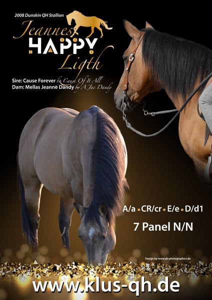 Happy jest bardzo zrównoważonym ogierem. Ma piękne, silne ciało z dużymi kopytami. Dokładnie taki, jakiego można sobie życzyć u Quartera. Plus silne nerwy i spokój. Happy jest dostępny do obejrzenia. W 2023 roku przeniósł się do nas z południowych Niemiec. Kandydujący ogier starej linii. Pokrył z nami jeszcze kilka klaczy w 2023 roku i nawet wtedy okazał się bardzo towarzyski podczas krycia w ręku w naturalnych skokach. Dlatego też spodziewamy się jego pierwszego potomstwa na naszej farmie już w 2024 roku. Będzie on kryty naturalnie na naszej farmie od marca 2024 roku.