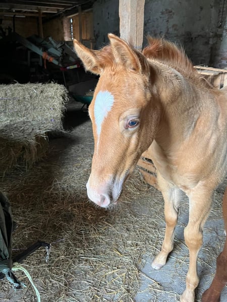 Triple Fire Boy - ein bildschöner Quarter Horse Hengst in der außergewöhnlichen Farbe Golden Champagne, geboren am 21.04.2025. Mit einem geschätzten Endmaß von ca. 150-155 cm, seinem kompakten, korrekt gebauten Körper und der tollen Bemuskelung ist er ein echter Hingucker mit sportlichem Potenzial. Kein Wunder, dass er nicht nur als 1a-Prämienfohlen ausgezeichnet wurde, sondern auch Reservesieger beim DQHA Fohlenchampionat 2025 ist. Dieser junge Hengst wächst artgerecht im Herdenverband auf großzügigen Koppeln auf und zeigt dabei einen entspannten, menschenbezogenen Charakter. Er ist verschmust, nervenstark und neugierig - gleichzeitig lernfreudig und bewegungsfreudig mit einem ausgeglichenen, aufgeweckten Temperament. Er wird täglich im Umgang gefördert, kennt Tierarzt, Hufschmied, Anhängerfahren und geht bereits als Handpferd mit ins Gelände. Halfterführigkeit, Hufegeben und Putzen sind für ihn selbstverständlich. Triple Fire Boy ist gesund, 5-Panel sowie MYHM n/n getestet, regelmäßig entwurmt und wird bei Abgabe altersgerecht geimpft übergeben. Der Farbtest liegt ebenfalls vor. Seine gute Abstammung lässt keine Wünsche offen - kombiniert mit seinem exzellenten Charakter und seinem Potenzial in verschiedenen Disziplinen eignet er sich sowohl für den Sport- und Turniereinsatz als auch als späterer Freizeitpartner oder Zuchthengst. Ob Show oder Sattel - Triple Fire Boy bringt alles mit, was man sich von einem vielseitigen Quarter Horse Nachwuchs wünscht. Er wird mit vollständigen AQHA-Papieren und Equidenpass in fördernde Hände abgegeben.