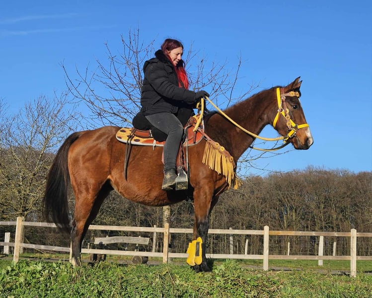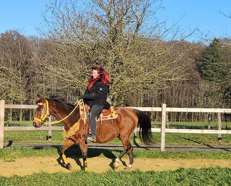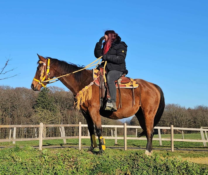 Quarter Horse mare with papers TENDER HOPE 9 years old Height: 1.52 m AKU (veterinary health certificate) included E-Pass included – Calm and well-behaved under saddle and in handling – Friendly and balanced – People-oriented and uncomplicated – Familiar with open stalls and herd management – Ready for further tasks in recreational riding Perfect for: Leisure riding, trail rides, and families with riding experience Our horses: – Regularly dewormed – Maintained by blacksmith and osteopath Farm shop: Western saddles, bridles, accessories Transport and equipment organized affordably upon request Our services: ✅ 3-month exchange guarantee ✅ Trial ride: €35, each additional horse €25 (credited if purchased on the same day) ✅ €100 immediate discount for pickup/transport on the same day ✅ Personal and honest advice Please inquire only by phone: 0171 – 4001968 Available daily from 8 a.m. to 8 p.m. ⚠️ No emails or WhatsApp messages ⚠️ All information without guarantee