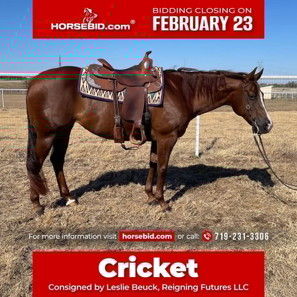💎 𝐓𝐇𝐄 𝓓𝓲𝓪𝓶𝓸𝓷𝓭 𝐒𝐇𝐎𝐖𝐂𝐀𝐒𝐄 💎 Happening now thru MONDAY | FEBRUARY 23rd - Available EXCLUSIVELY on HorseBid's website! For more details and to register visit: www.Horsebid.com CONSIGNOR CONTACT: Leslie Beuck, Reigning Futures LLC 719-231-3306 LOCATION: Burleson, TX BREED: AQHA REGISTERED: Yes REGISTERED NAME: Be My Lucky Cricket COLOR: Chestnut HEIGHT: 15 AGE: 10 GENDER: Mare A granddaughter of the legendary reining stallion Wimpy’s Little Step, this sweet girl is a great all-around riding partner with a quiet disposition and a versatile foundation. She’s been ridden both Western and English, has experience with small jumps and cross-country, and is a confident trail horse. She’ll walk easily through water and over tarps, and you can stand on her and slide off her butt without phasing her. She has been in training in our reining program the past few months, improving quickly in her general body control and loping frame. However, she is not finished in reining maneuvers. This mare would make a fantastic partner for a confident, older youth or an adult looking for a versatile horse to enjoy. Head to some open shows or play days, enjoy the trails, or just go for a pleasant lope in the arena. The choice is yours with this sweet, quiet mare. At approximately 15 hands and 1200 pounds, Cricket is a nice, comfortable size. Up to date on farrier, deworming, and vaccinations. If you have further questions, please contact Leslie Beuck at (719) 231-3306.